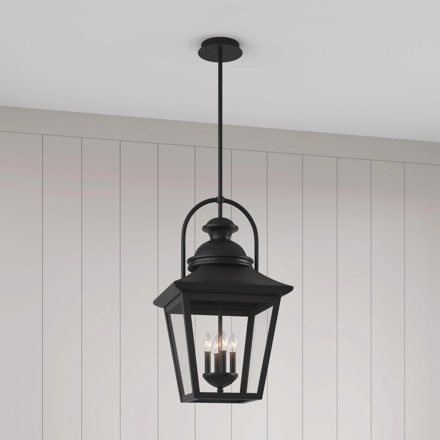 The Cedar Manor 4-Light Pendant is a versatile classic, suitable for indoor or outdoor use without overwhelming either space. The traditional styling features clear glass, a cluster of four candelabra lamps, and an iron ash finish that’s highlighted in bronze patina. Suspended by a sturdy downrod, this fixture will hang safely and beautifully. Mounting hardware is included for an easy installation.