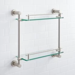 The two-shelved Ceeley Collection Tempered Glass Shelf is a great way to add style and space to your bathroom. Featuring a simple, yet modern design, this shelf is perfect in any style home. The decorative railings also help prevent toiletries from falling.