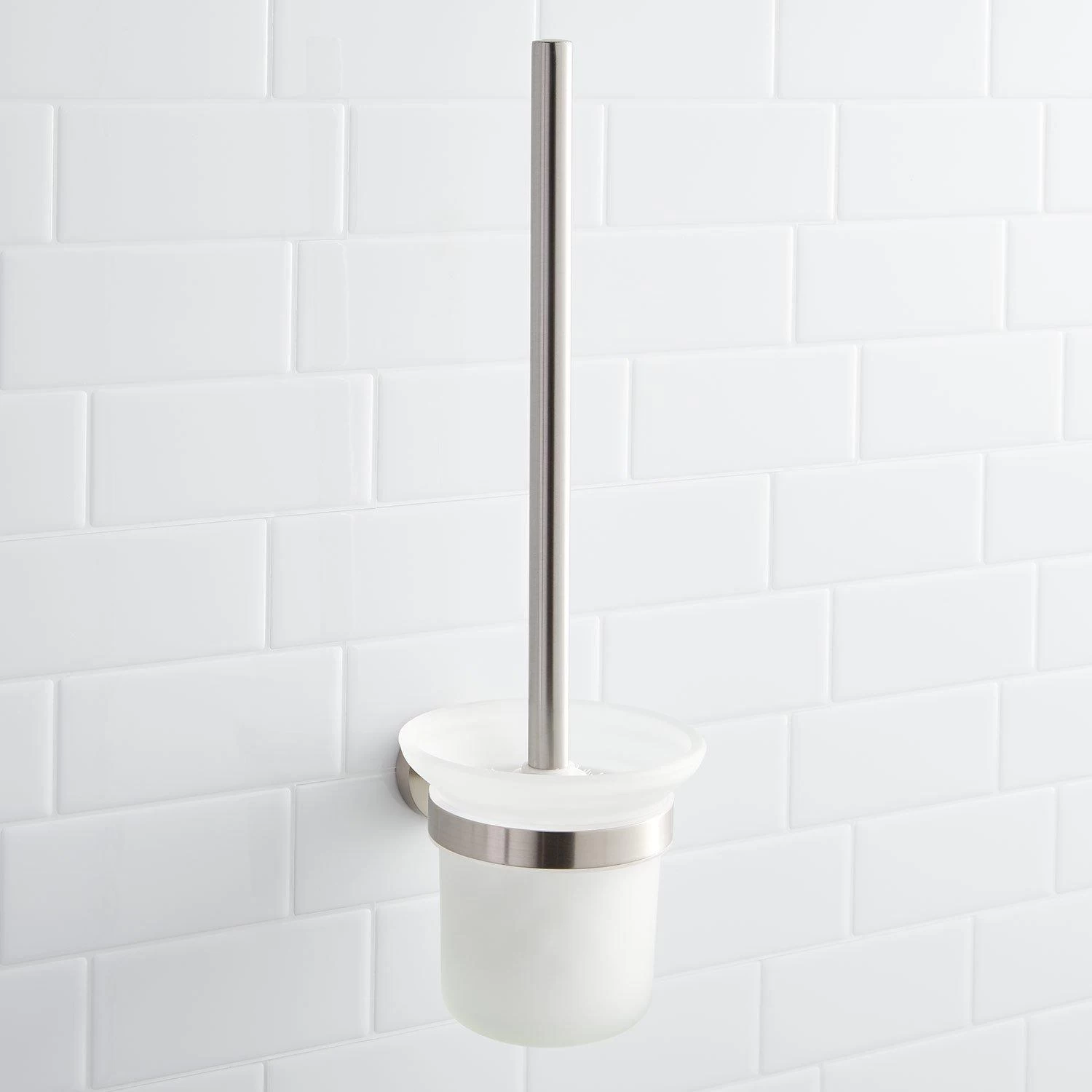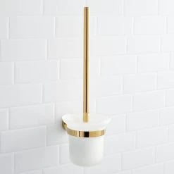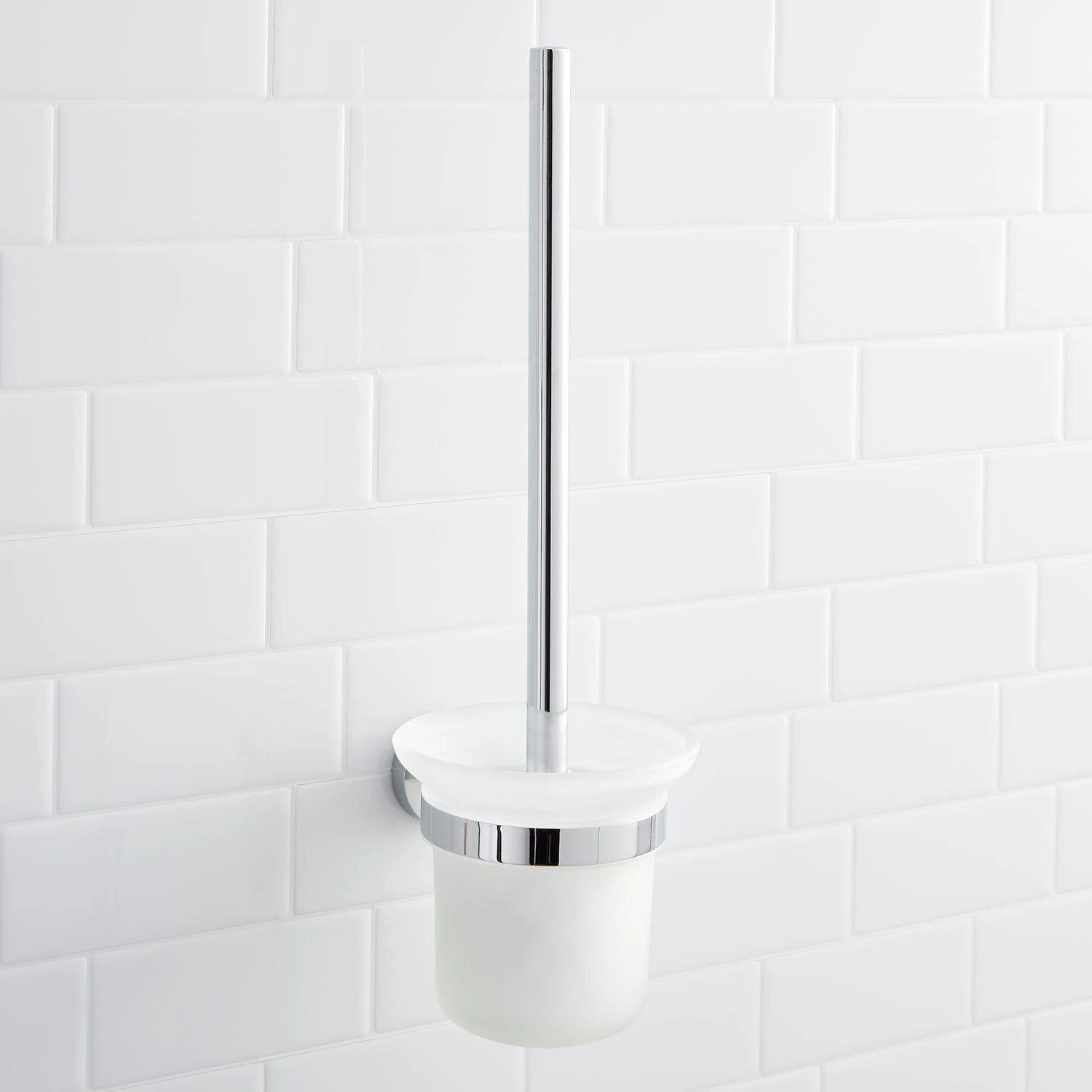 The Ceeley Collection Wall-Mount Toilet Brush Holder is made of solid brass and features a charming frosted glass container. Perfect for keeping your cleaning supplies nearby while remaining stylish and discreet.