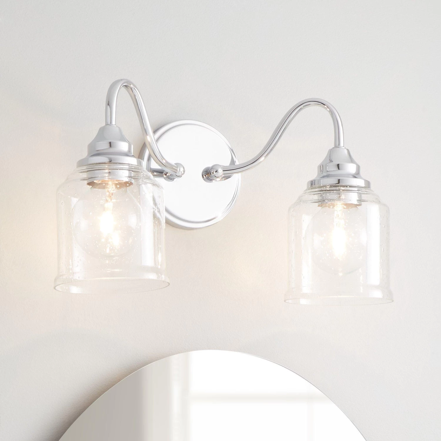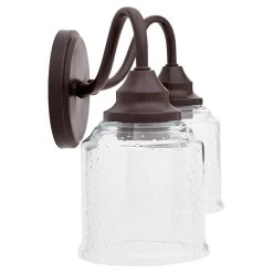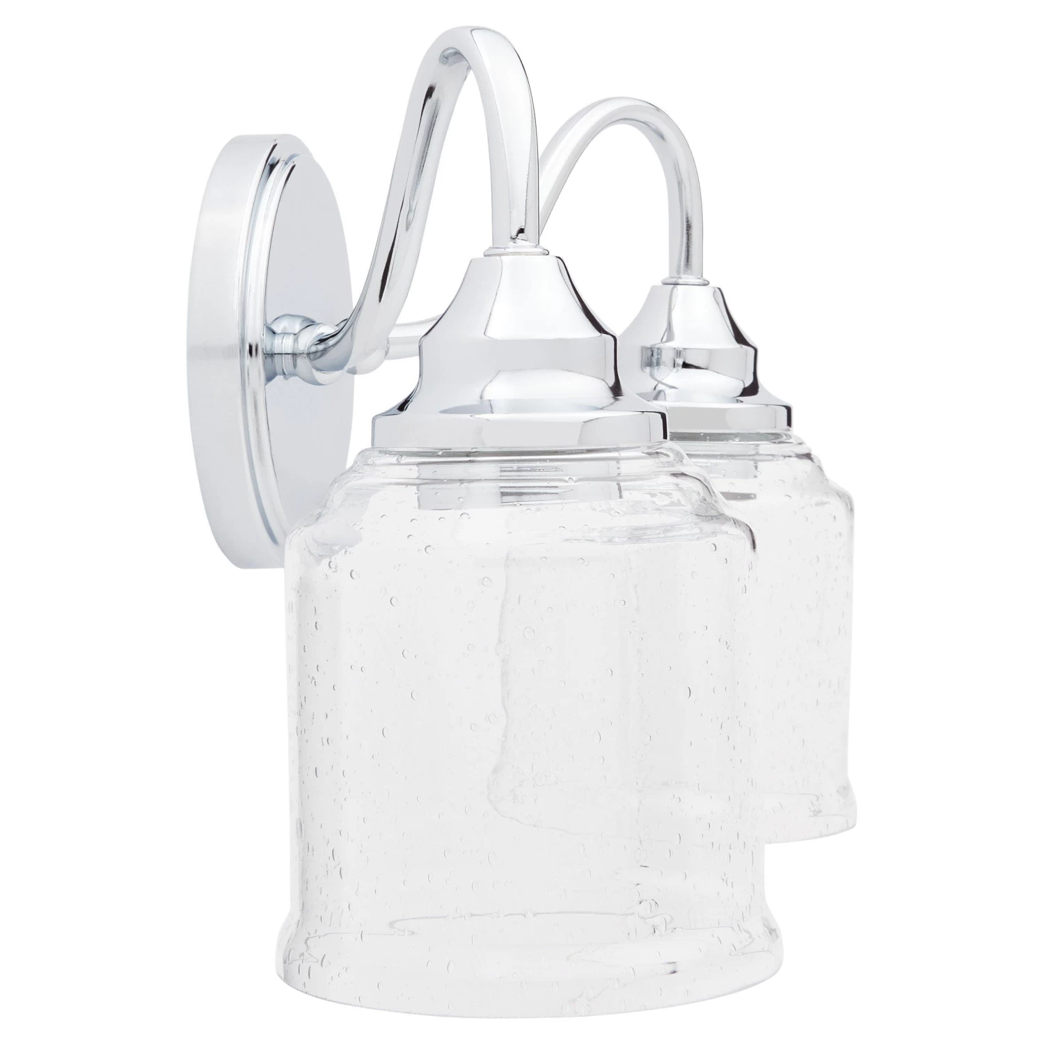 The Centerville 2-Light Vanity Light proves simple can be inspiring. Sloping support arms and clear, seeded glass shades lend a whimsical feel to this elegant fixture. Hang this classy lamp in your guest or master bath for a charming update. Comes with mounting hardware necessary for installation.