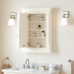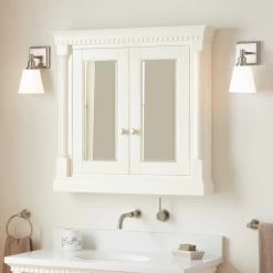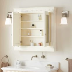 Add a sense of grandeur to your bathroom update with the Claudia Medicine Cabinet. Set in a classic white finish with brushed nickel hardware, the exquisite detailing of this mahogany build creates a stunning statement. Adorning the cabinet are two convenient mirrors, while three adjustable shelves reside behind the doors, keeping essentials out of sight yet quickly accessible. Soft-close hardware ensures smooth, quiet everyday use. For easy installation, a French cleat mounting system is included.