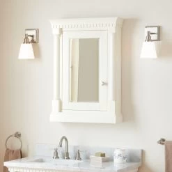 Add a sense of grandeur to your bathroom update with the Claudia Medicine Cabinet. Set in a classic white finish with brushed nickel hardware, the exquisite detailing of this mahogany build creates a stunning statement. Adorning the cabinet are two convenient mirrors, while three adjustable shelves reside behind the doors, keeping essentials out of sight yet quickly accessible. Soft-close hardware ensures smooth, quiet everyday use. For easy installation, a French cleat mounting system is included.