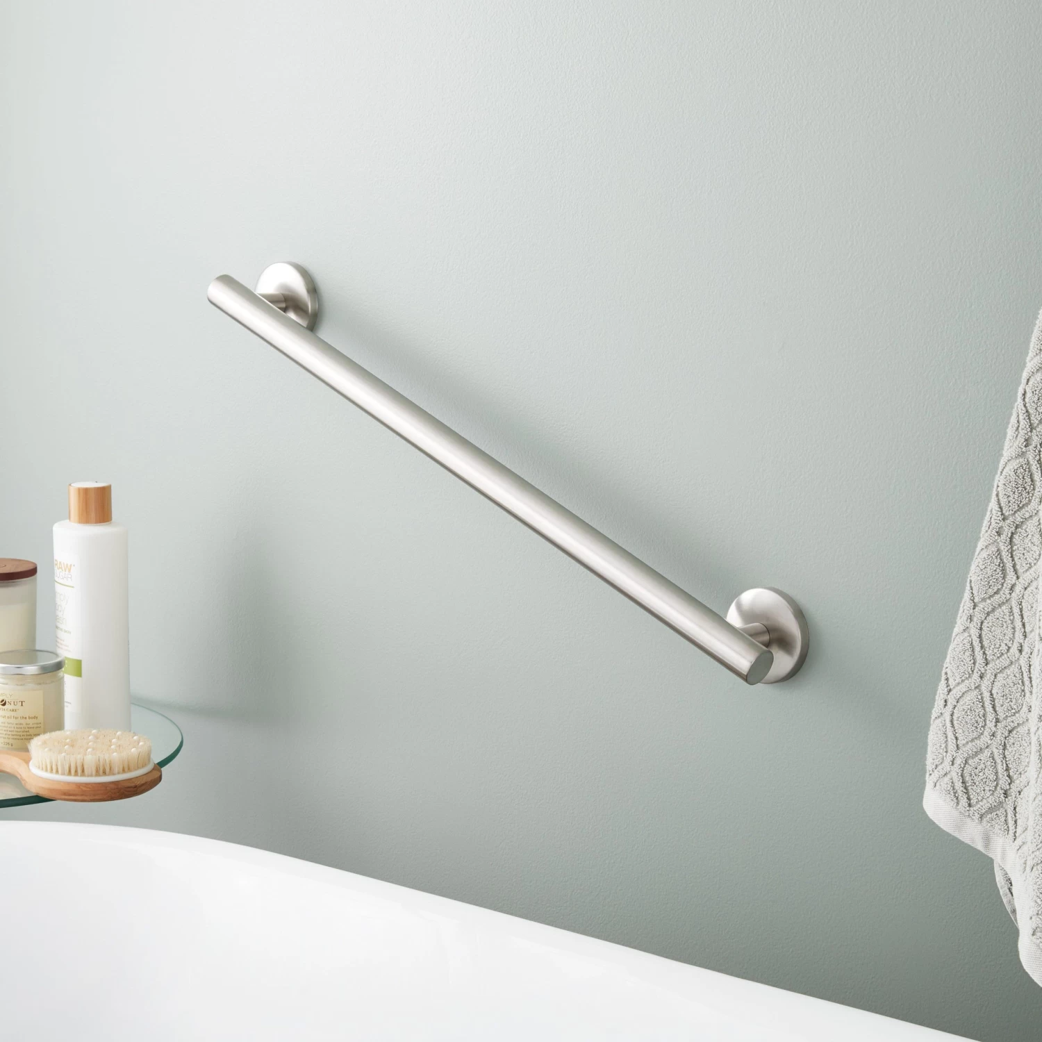 The Contemporary Grab Bar is a safe and stylish solution for a modern-designed bathroom. This product mounts securely to your wall to aid you while moving throughout your space. Available in two sizes and your choice of corrosion-resistant finish, this fixture comes with all the necessary hardware for an easy installation.