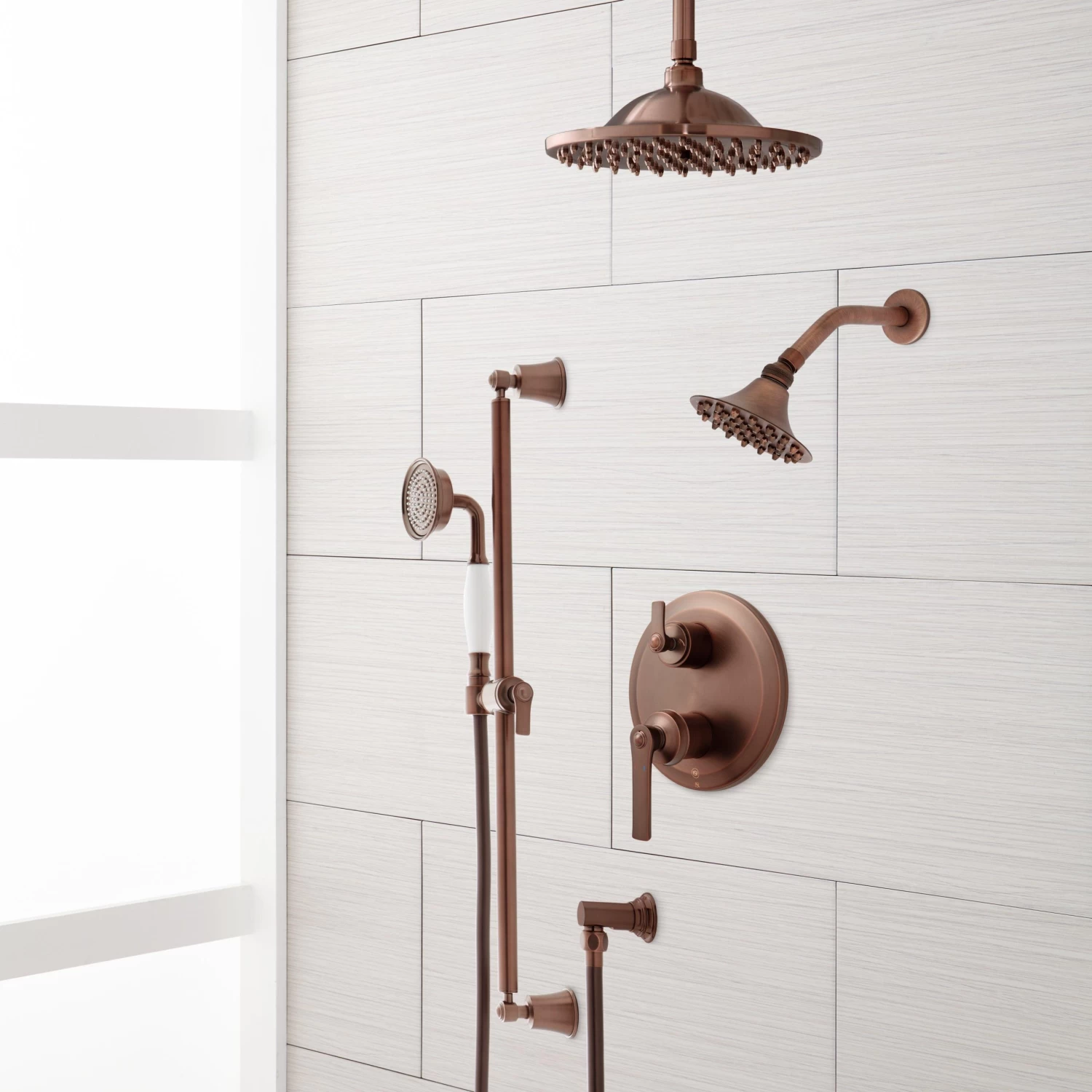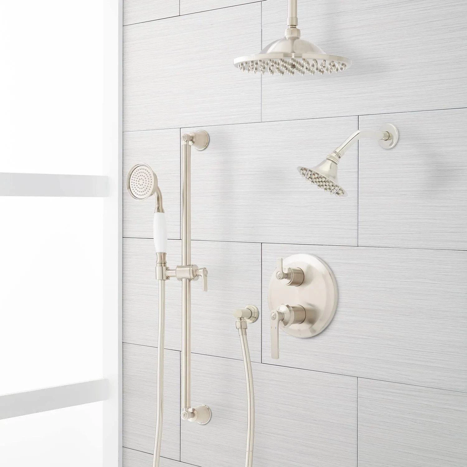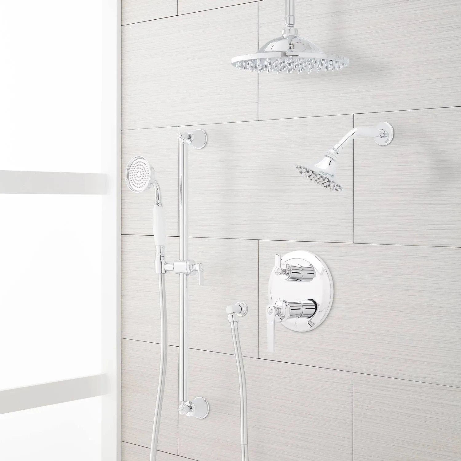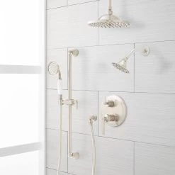 - Shower system includes rainfall shower head and 6″ ceiling mount shower arm, wall mount shower head with 8″ shower arm, wall mount slide bar with hand shower and hose, hand shower water connection, and a pressure balanced valve with 3-way diverter.