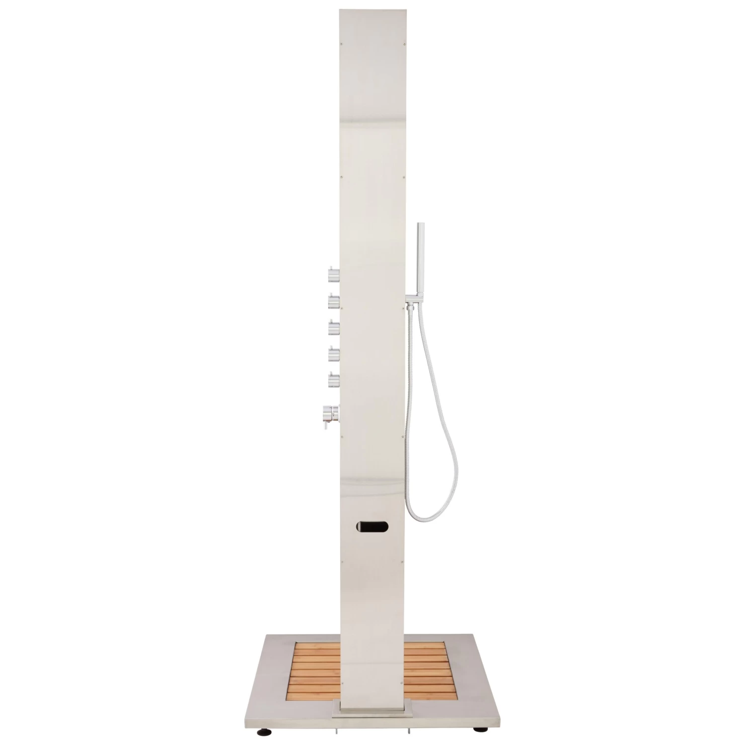 Experience a soothing rinse from multiple angles with the Dalton Outdoor Stainless Steel Shower Panel. Stand on the bamboo tray as water cleanses and massages the body. For added convenience, the Dalton comes with a sleek hand shower.