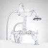 The Deck-Mount Tub Faucet with Hand Shower brings nostalgic charm to your bathroom. This tub faucet features a hand shower and porcelain accents, creating a beautiful profile.
