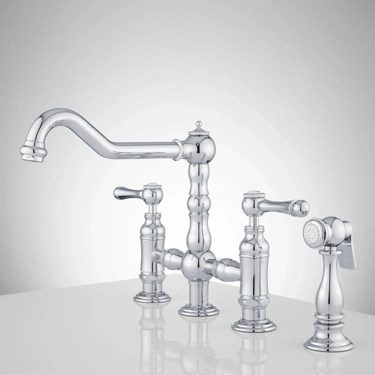 This luxurious bridge faucet features an elegant hook spout, a sculpted body and shapely lever handles. Made of high quality materials with a matching side spray.