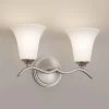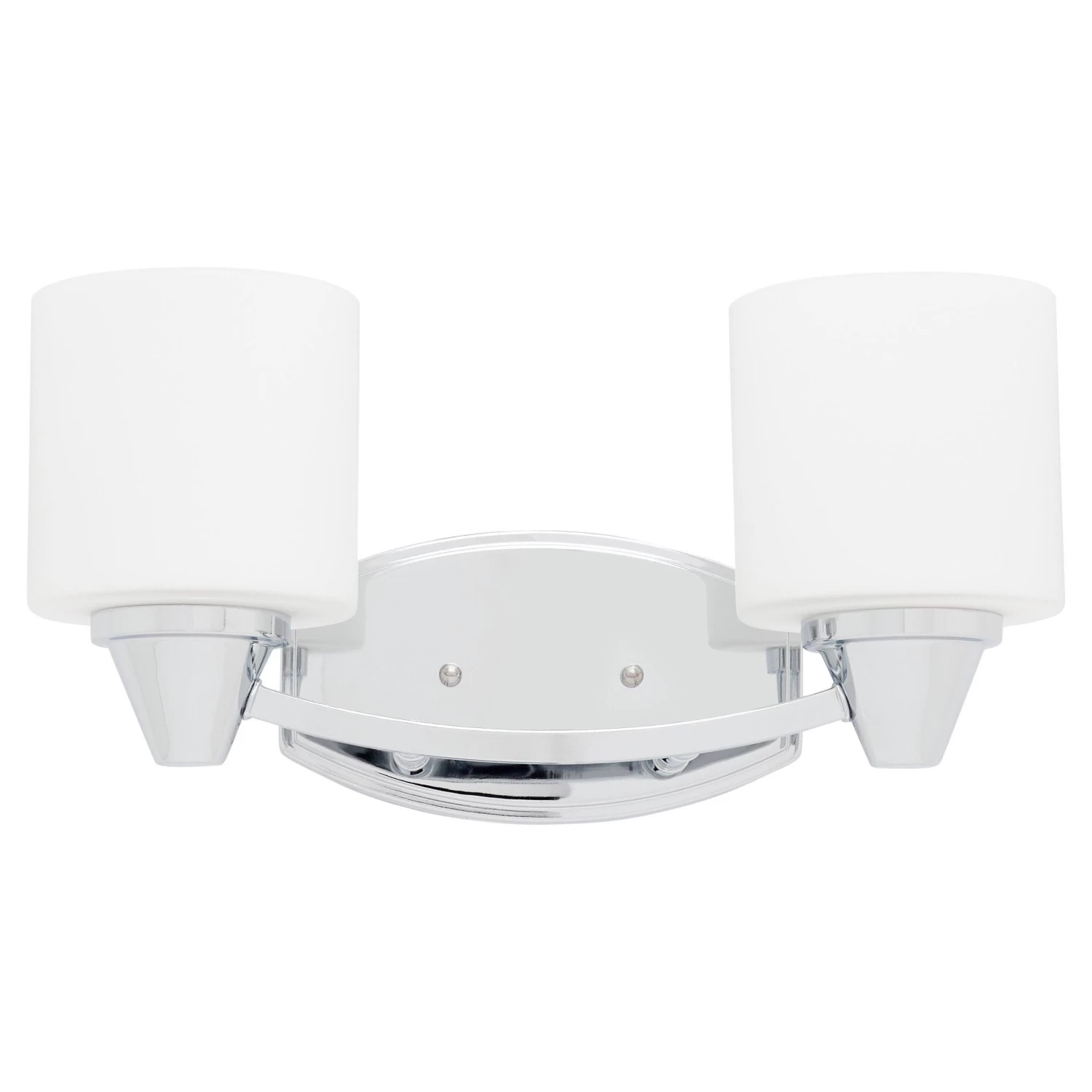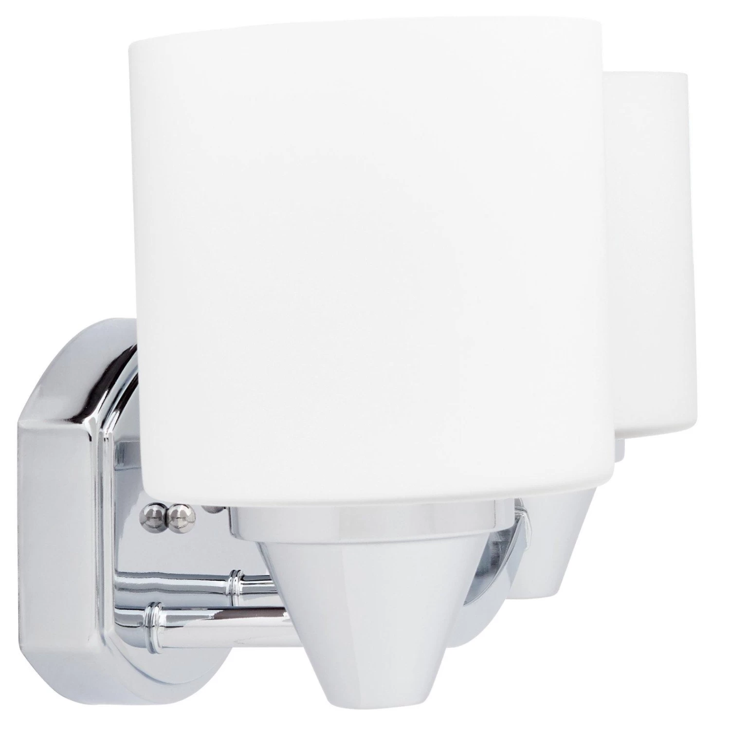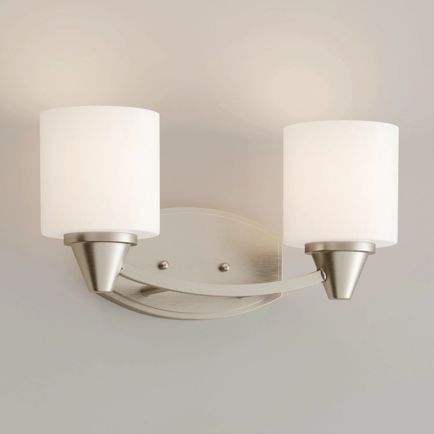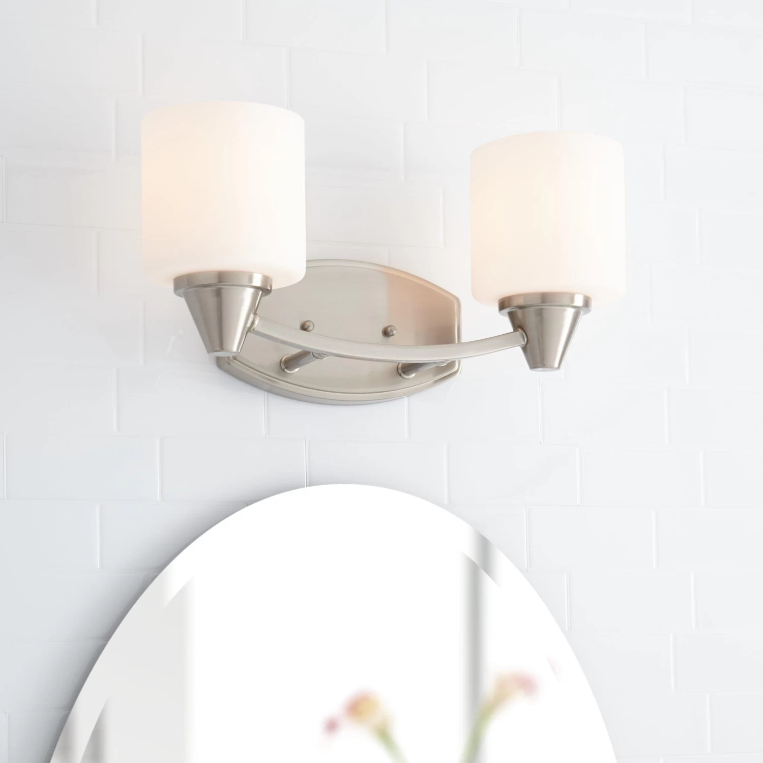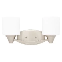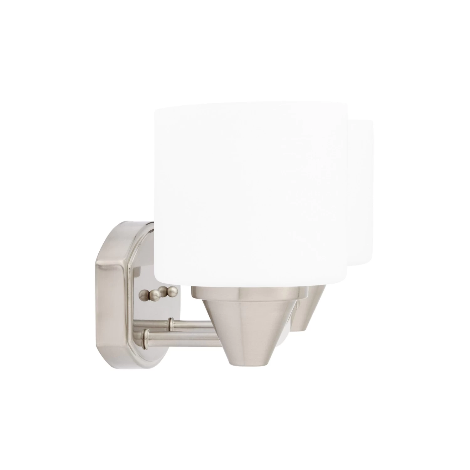 Sleek and angular curves give the Eastover Vanity Light a modern look. The shades are made of opal glass, which are supported by cone-shaped bases. The metal is covered in a tarnish-resistant finish to complement existing fixtures.