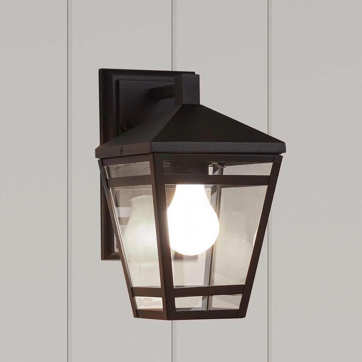 The Edgehill Outdoor Entrance Wall Sconce takes inspiration from traditional carriage lanterns. Unrestricted light shines through open framework and large, clear glass panes. This understated black aluminum fixture finds home in both traditional and transitional styles. Mounting hardware is included for easy installation.