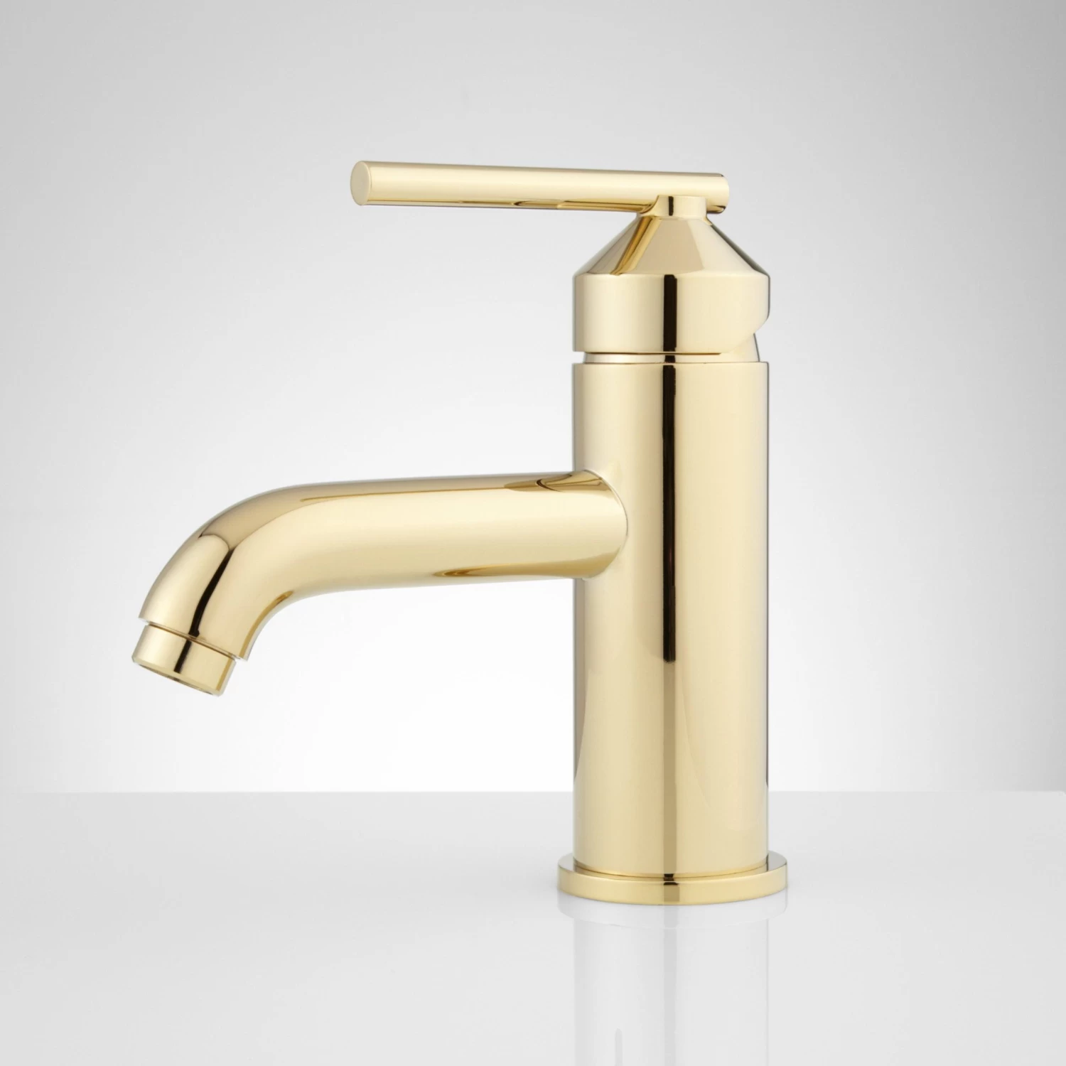 Update a bathroom sink with the Engle Single-Hole Faucet’s sleek lines and interesting shapes. A slim lever handle makes this fixture easy to use, while and solid brass construction with a polished finish make it an appealing addition.