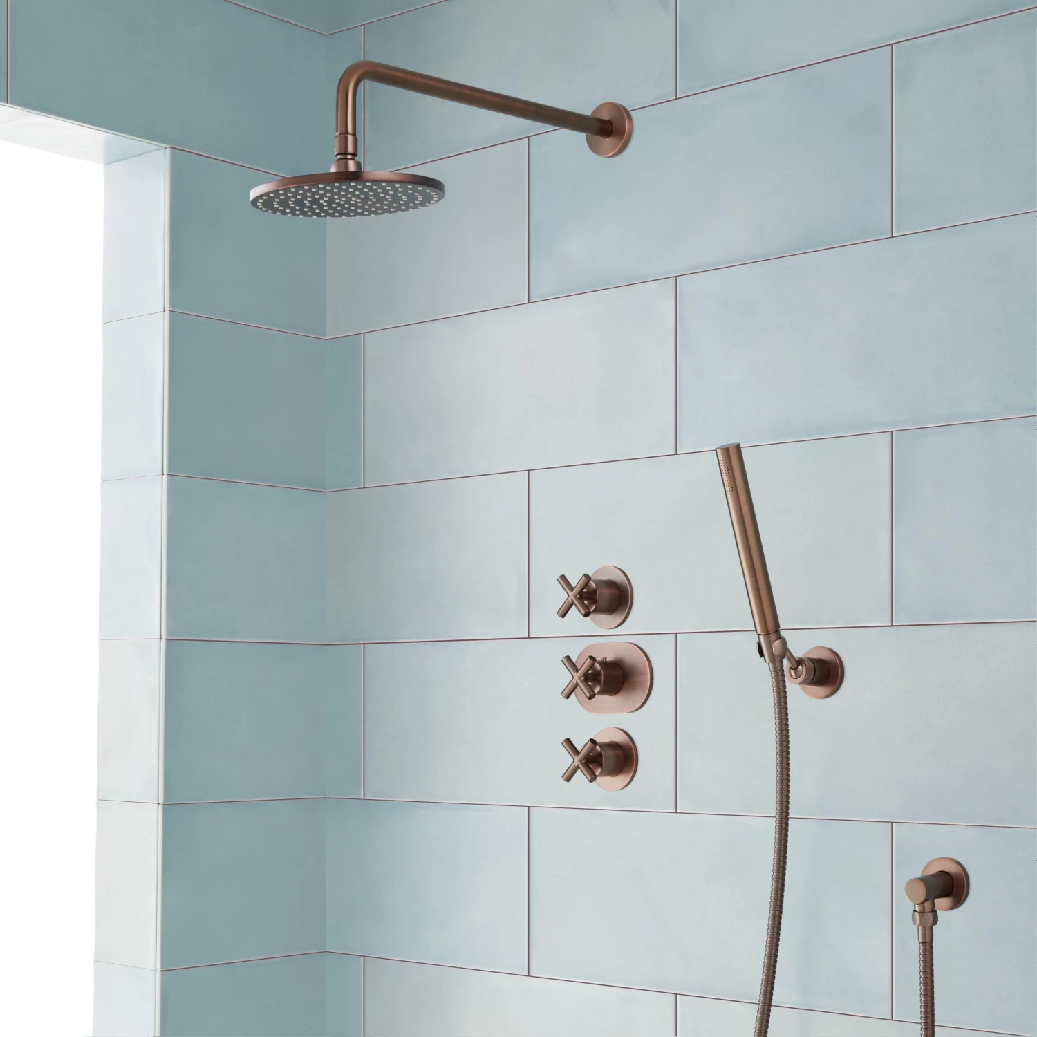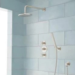 - Shower system includes wall mount rainfall shower head, wall-mount pivoting cradle, hand shower, hand shower water connection and a thermostatic 2-way in-wall diverter.