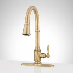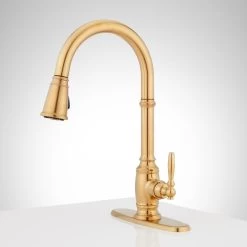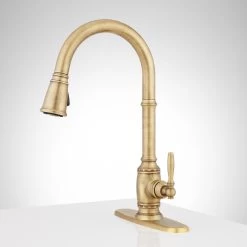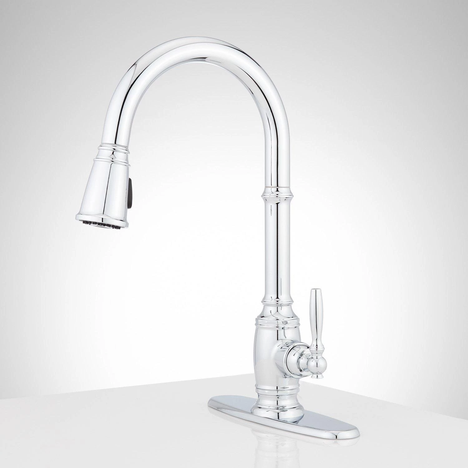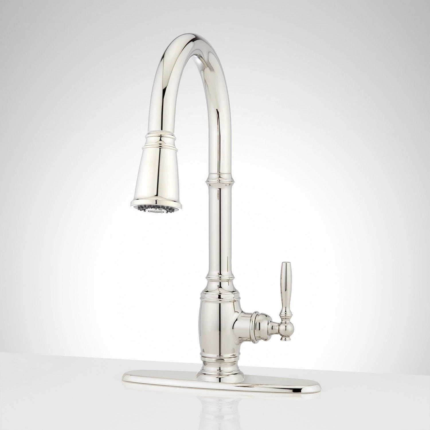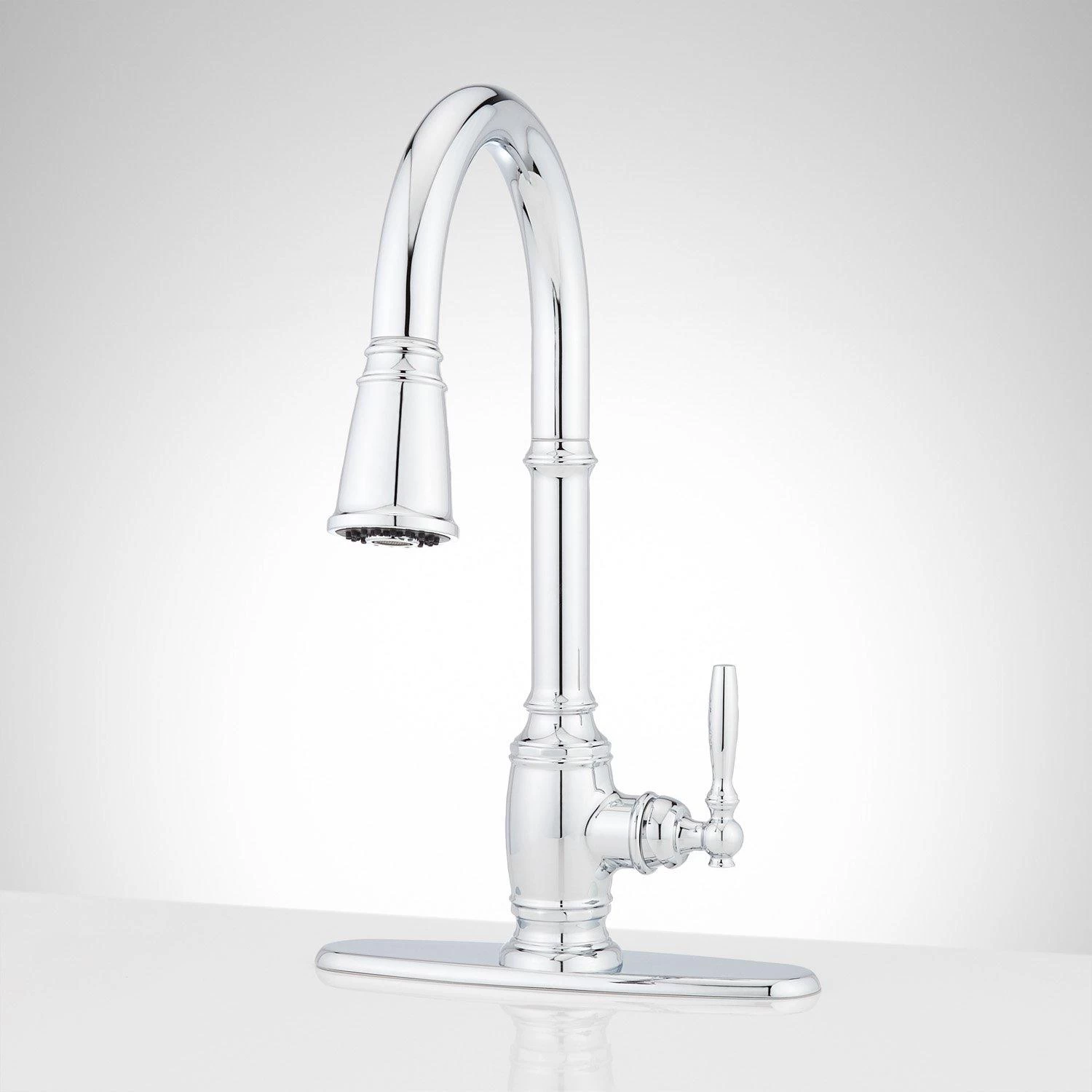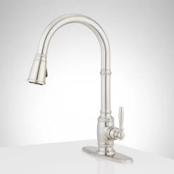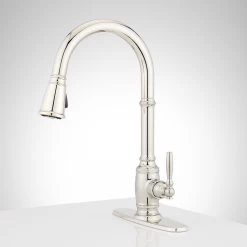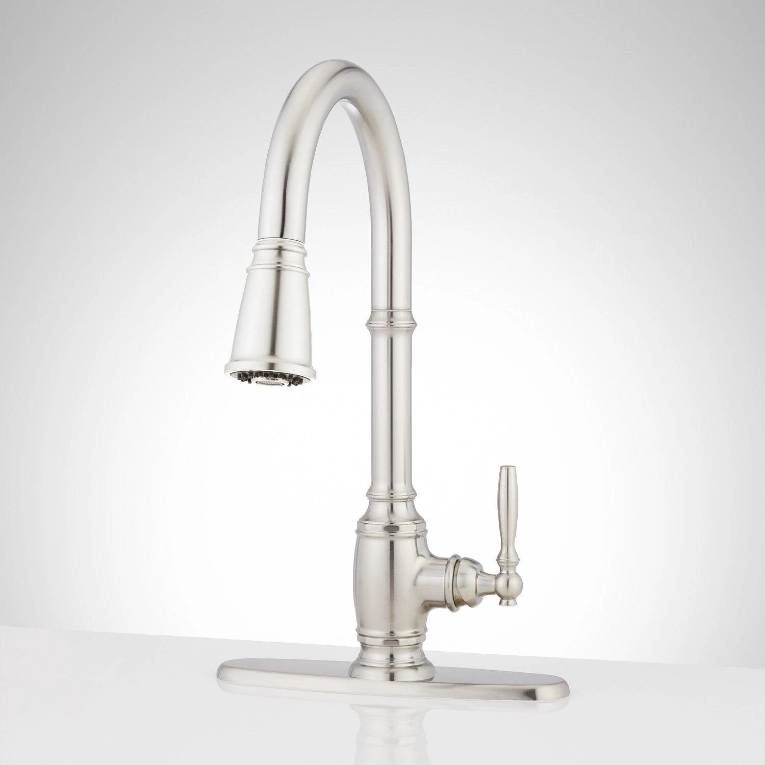 Let the Finnian Pull-Down Faucet with Deck Plate deliver traditional elegance to your kitchen. Perfect for a variety of styles, this stunning piece features subtle detailing along its gooseneck silhouette. In addition to its eye-catching look, functionality is built into every facet of its design. A lever handle controls both temperature and water volume, streamlining its overall performance. Its high-arch accommodates large pots and pans while its pull-down head allows you to rinse hard-to-reach areas of your sink with ease. A dual-function sprayer switches between an aerated stream and a powerful spray depending on your needs. Choose your favorite finish to complete the look.