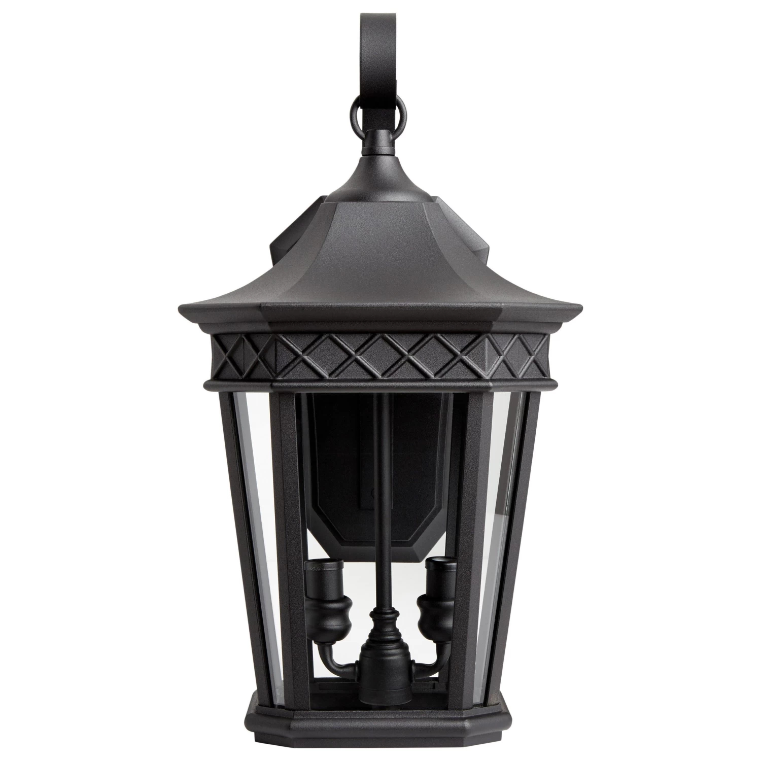 Lantern-inspired styling of the Foxfield 2-Light Outdoor Entrance Wall Sconce balances tradition with grandeur. This lamp features decorative touches such as tapered edges, candelabra bulbs, and a diamond-patterned cornice. Made of aluminum, this fixture will provide lasting illumination to your entryway.