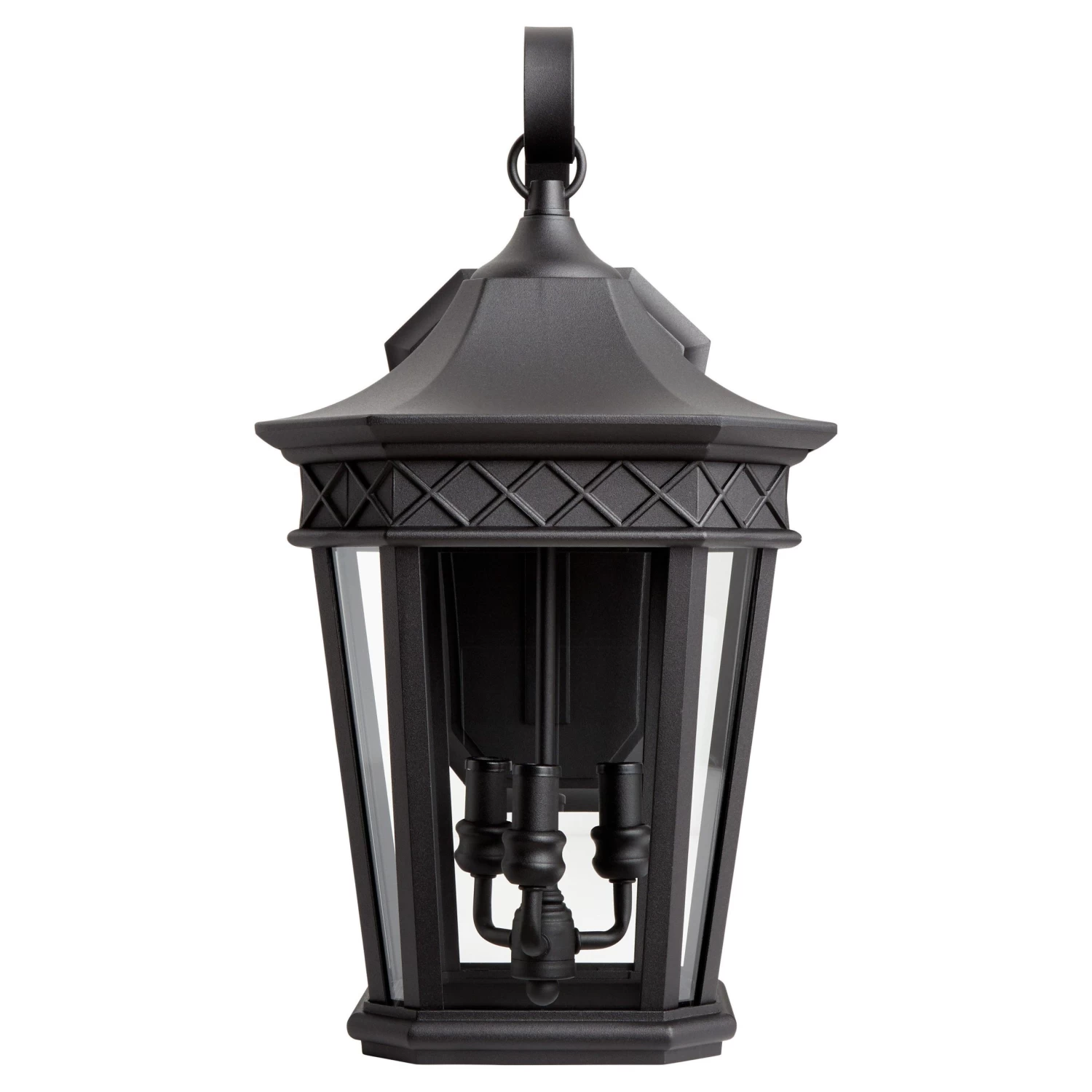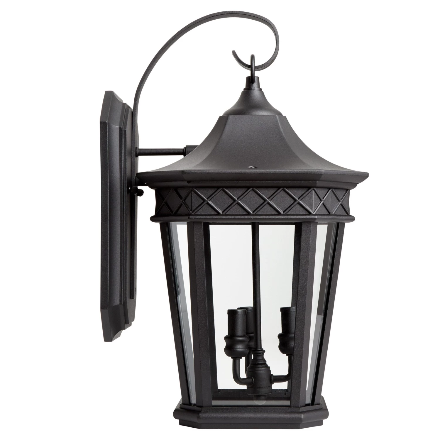Lantern-inspired styling of the Foxfield 3-Light Outdoor Entrance Wall Sconce balances tradition with grandeur. This lamp features decorative touches such as tapered edges, candelabra bulbs, and a diamond-patterned cornice. Made of aluminum, this fixture will provide lasting illumination to your entryway.