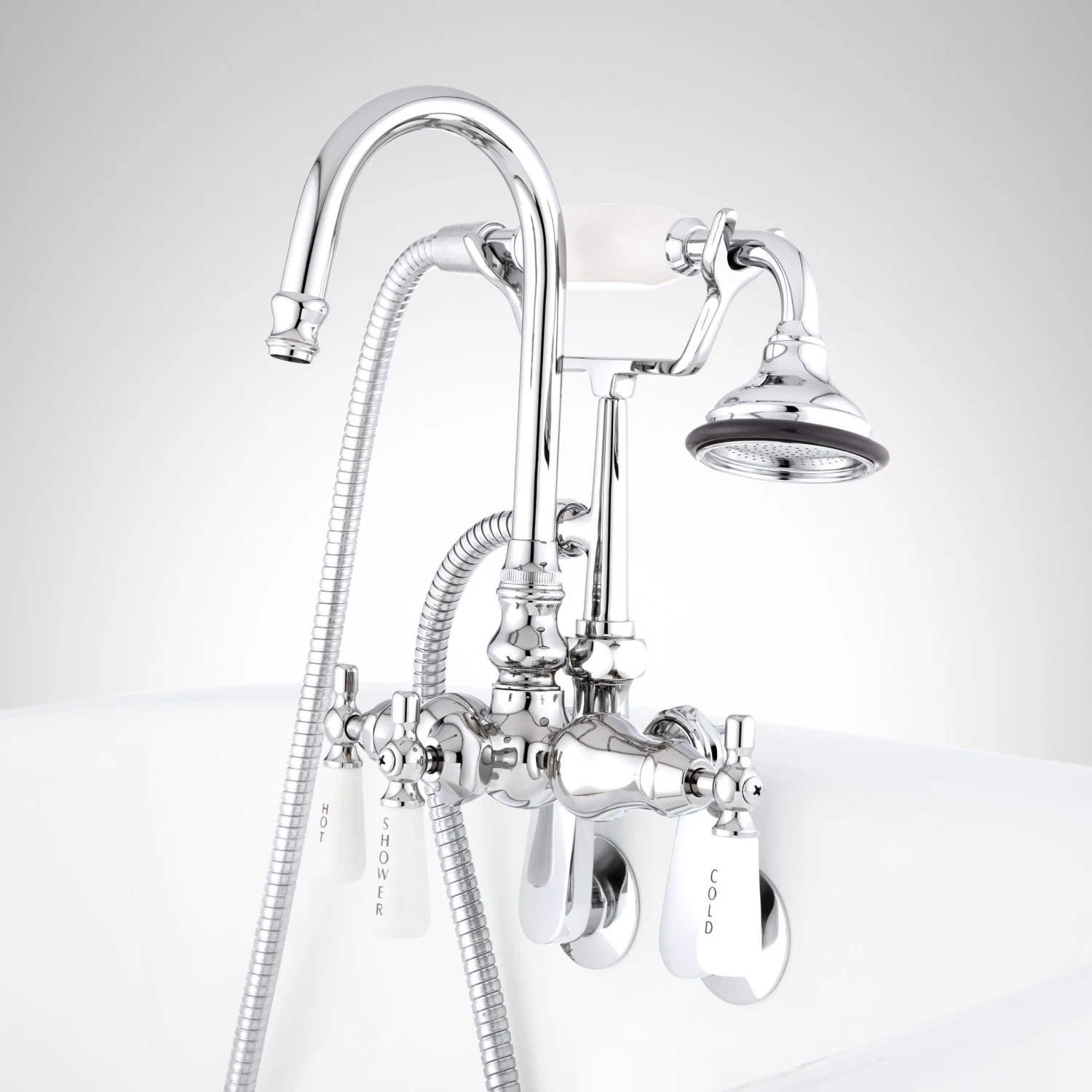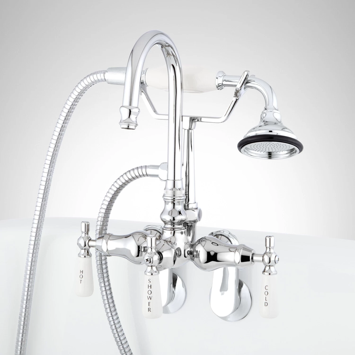 This gooseneck faucet and hand sprayer combines function and beauty with its stylish design and useful hand shower. The included swing arm couplers allow for use on tubs with 7″ wall drillings.