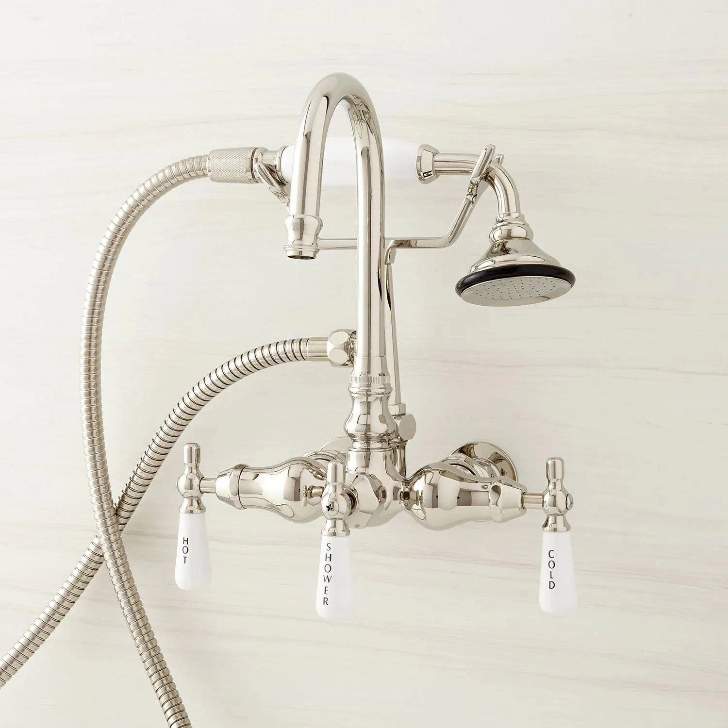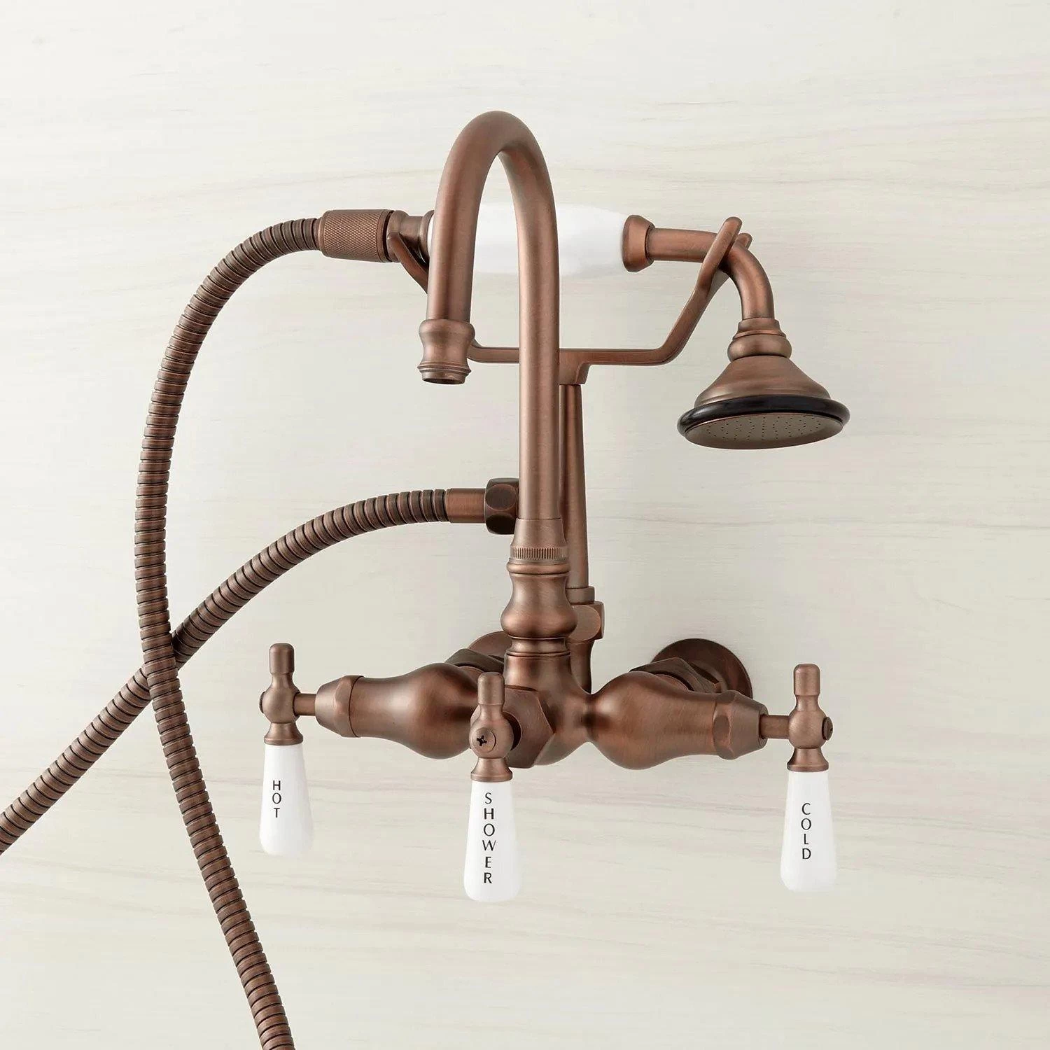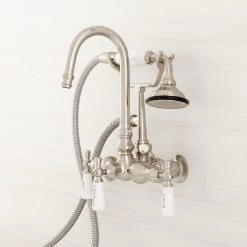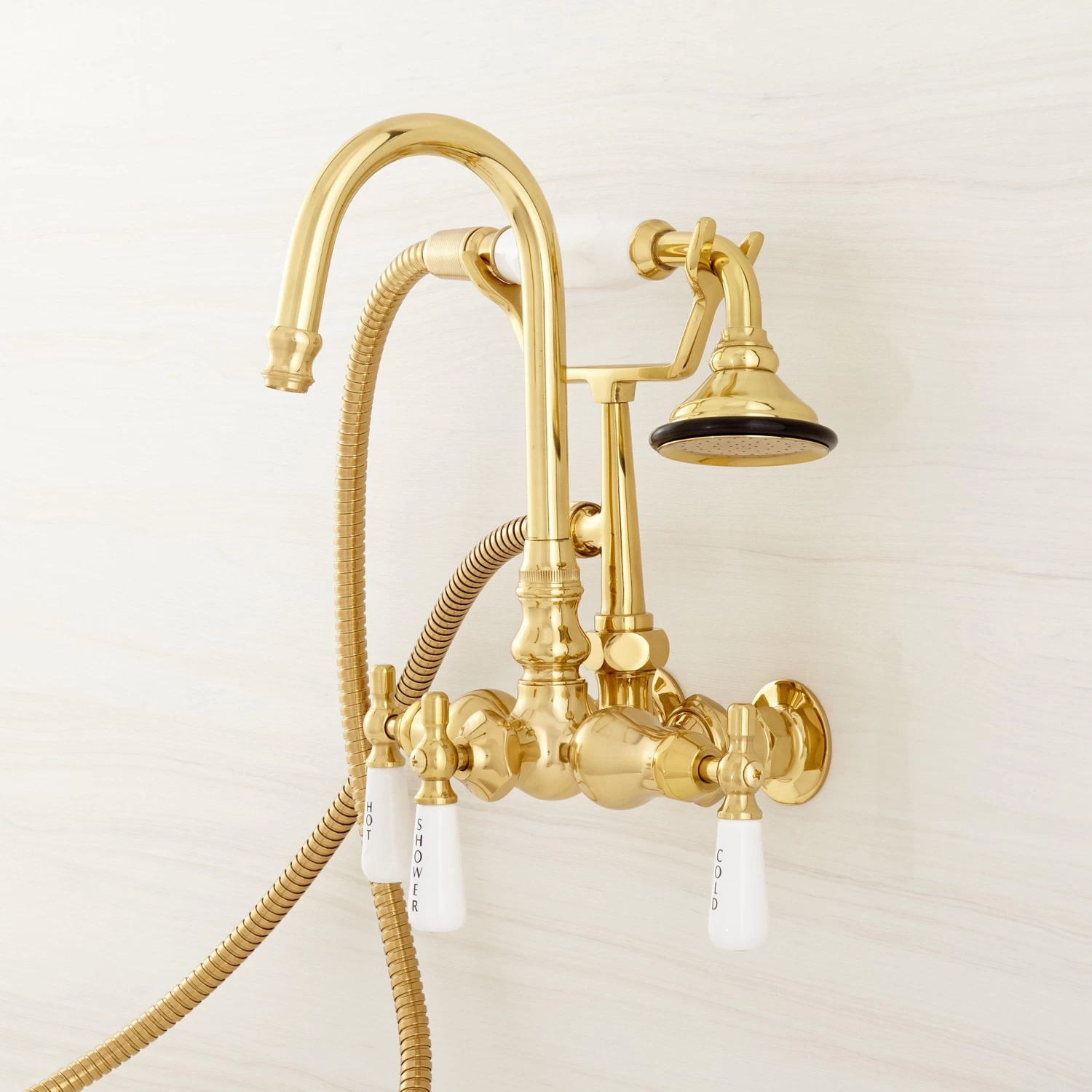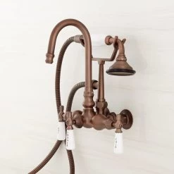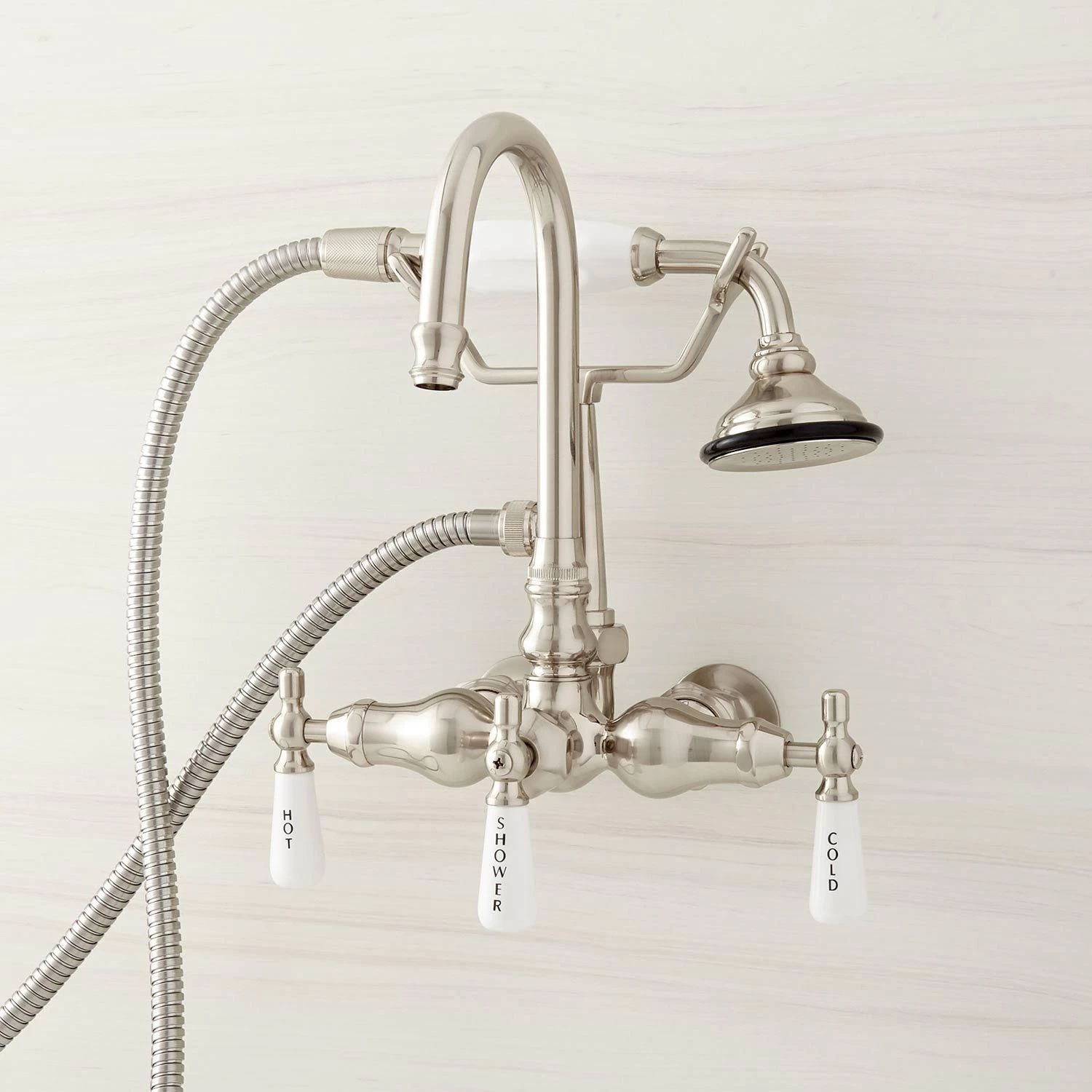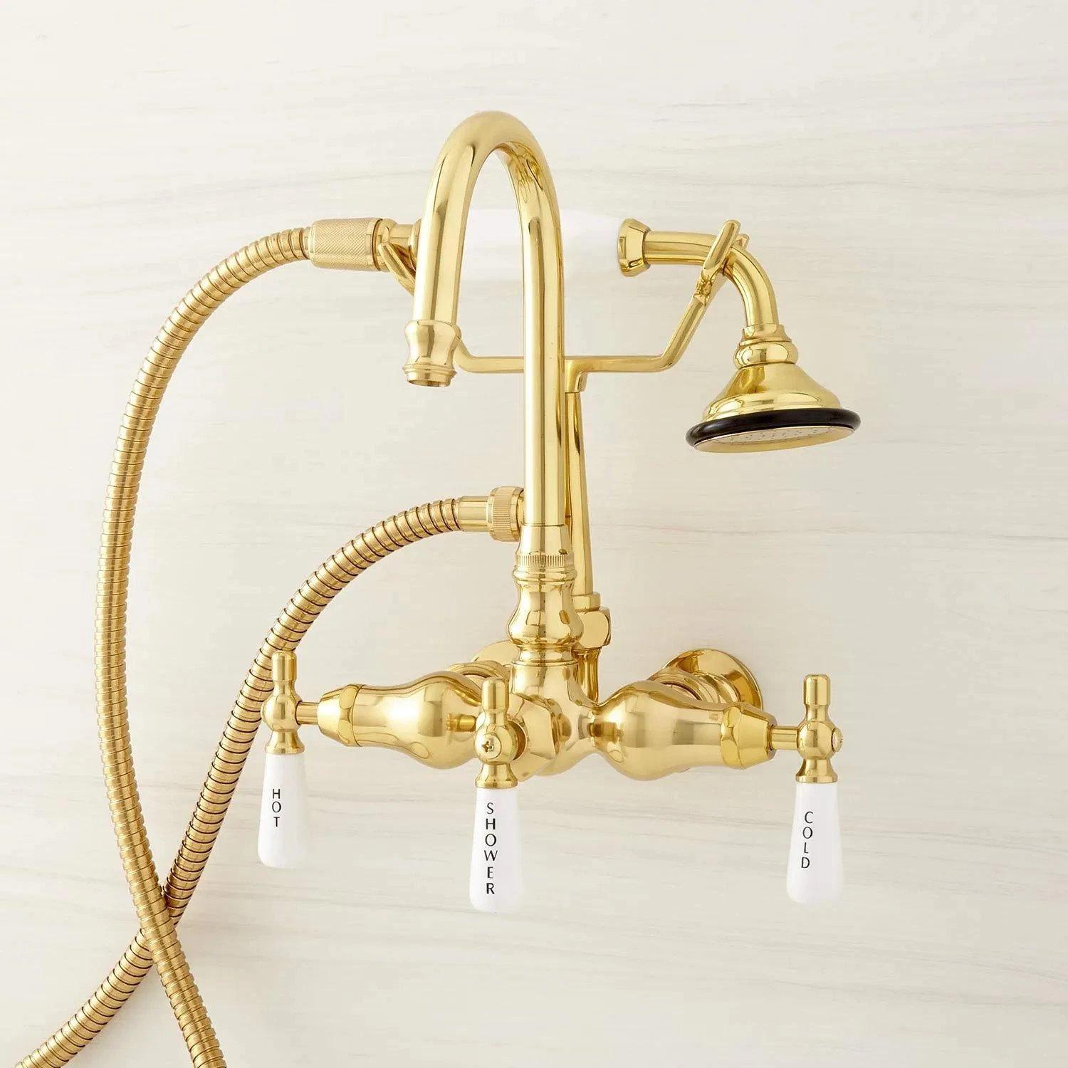 This gooseneck tub faucet with an included hand spray features a traditional design with a touch of modern flair, making it great for any style bathroom.