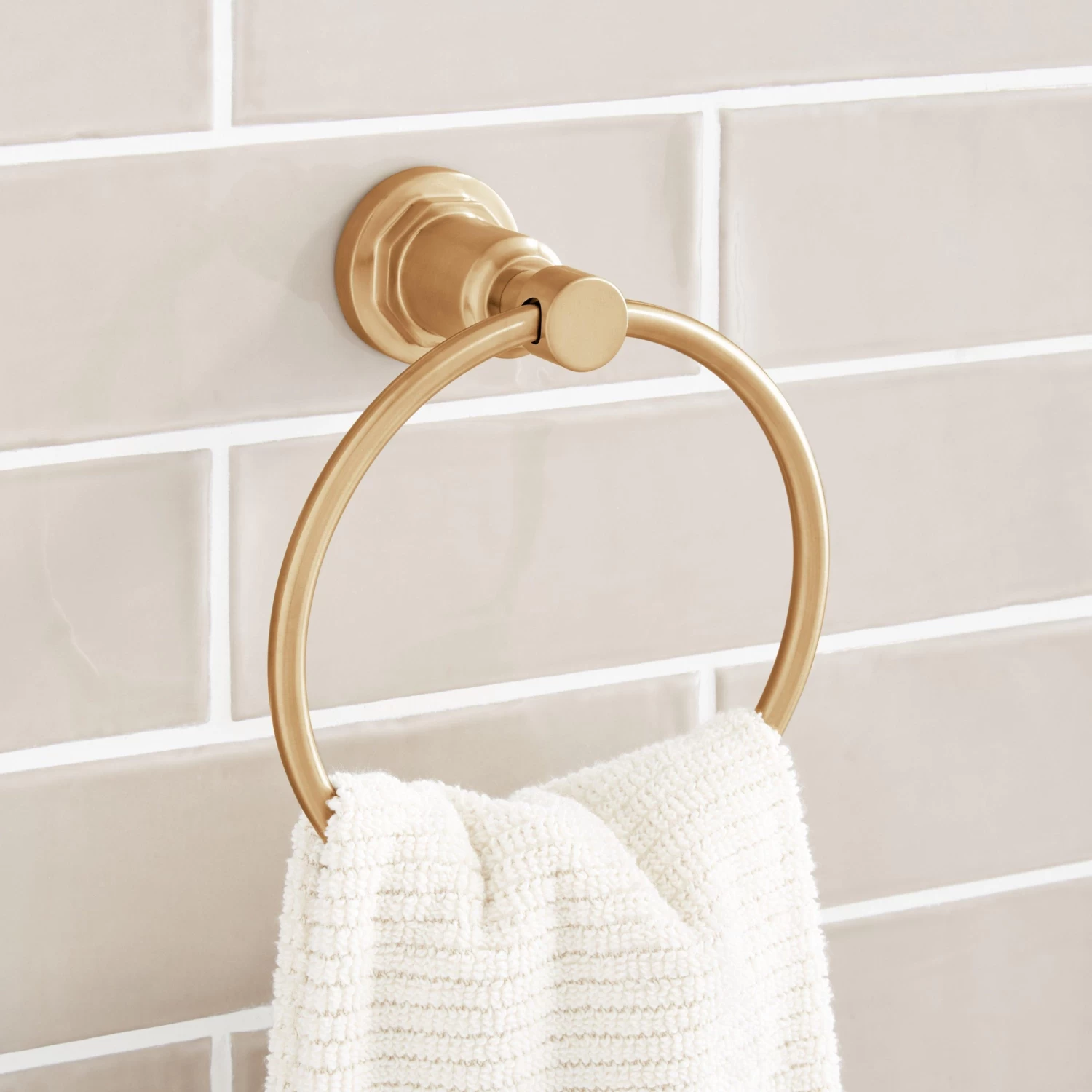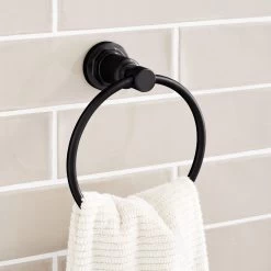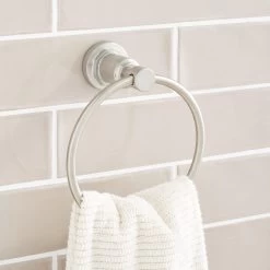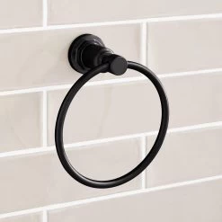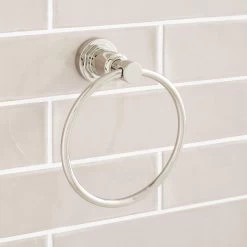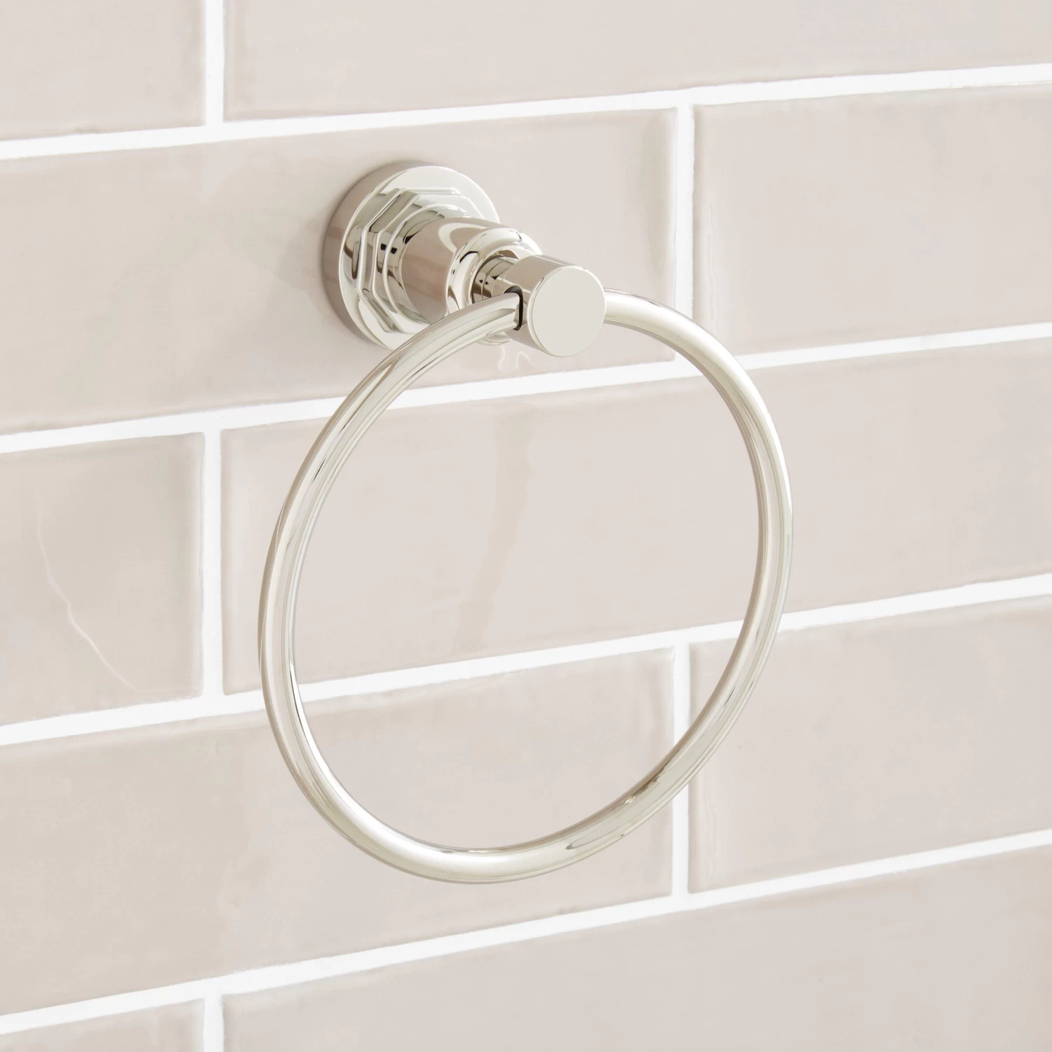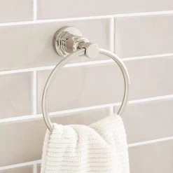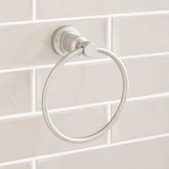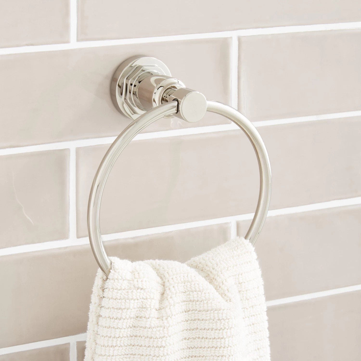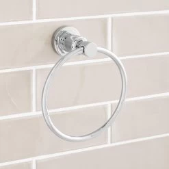 The Greyfield Towel Ring is a sleek accessory for a contemporary bathroom. The simple design features a round shape and subtle styling. Suitable for a wet environment, this holder has a tarnish-resistant finish that promises to last. Mounting hardware is included for easy installation.
