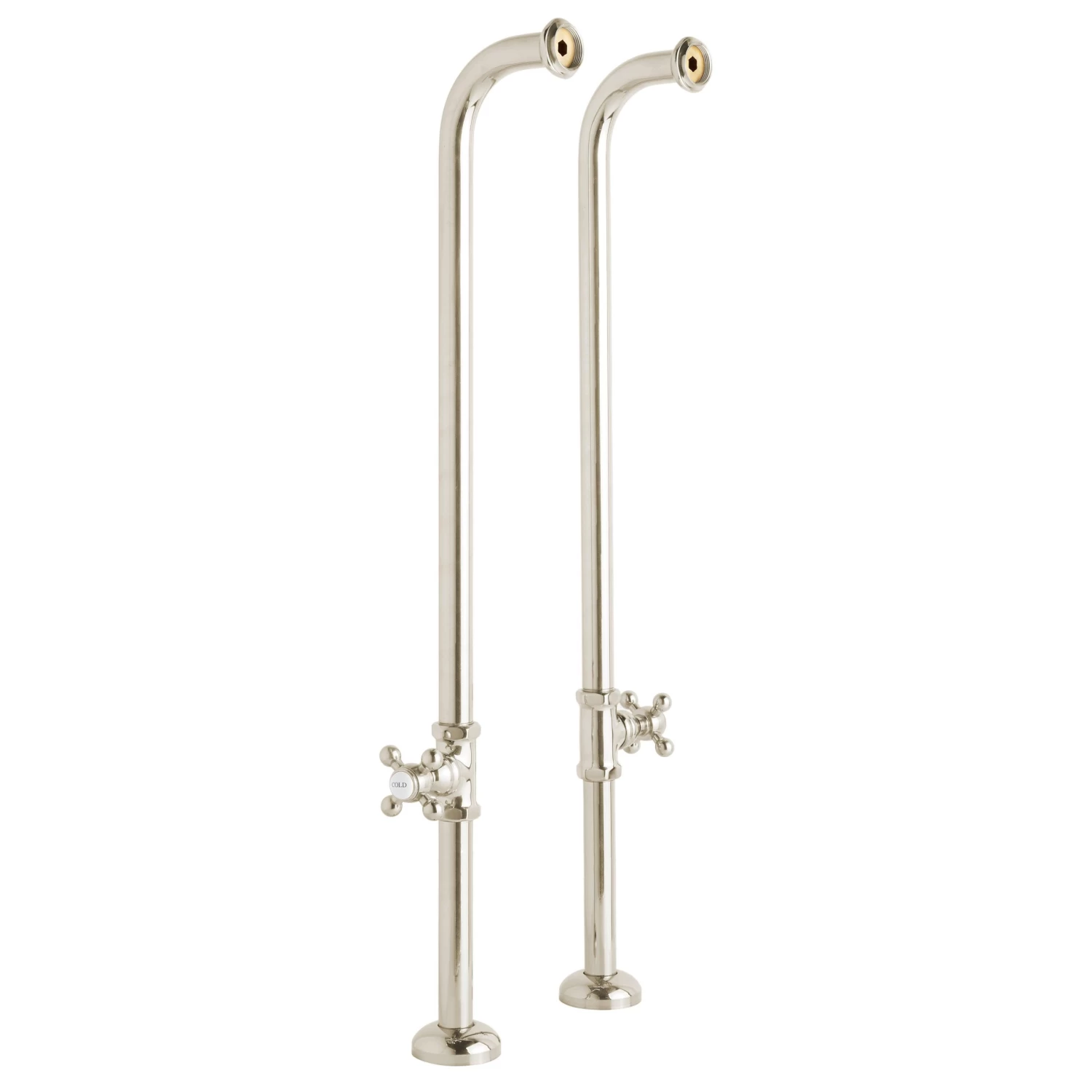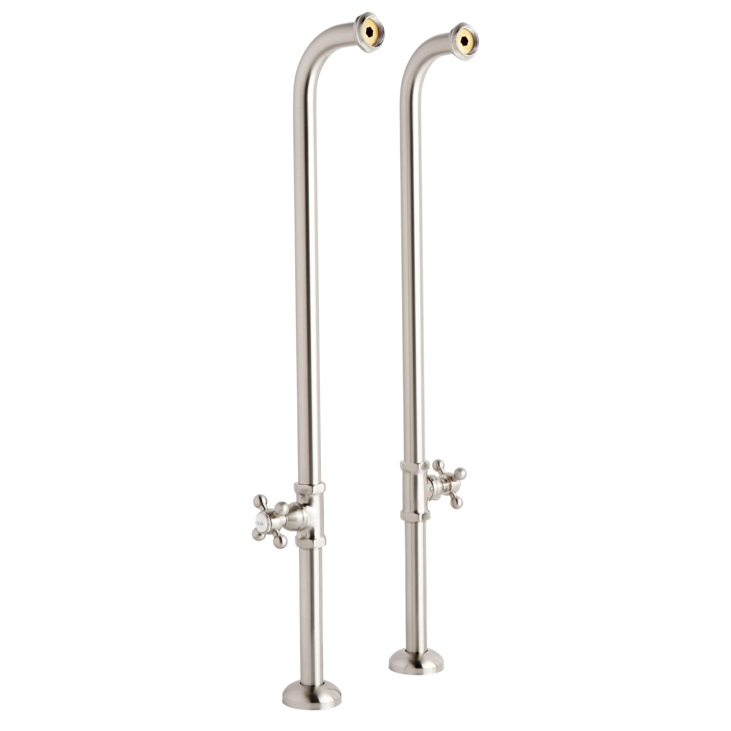 A remarkable combination of classic beauty and innovative design, these tub supply lines are made of heavy duty, solid brass pipe and require no wall supports at all. Graceful curves and porcelain buttons lend a bit of antique flair.