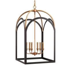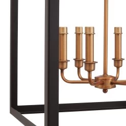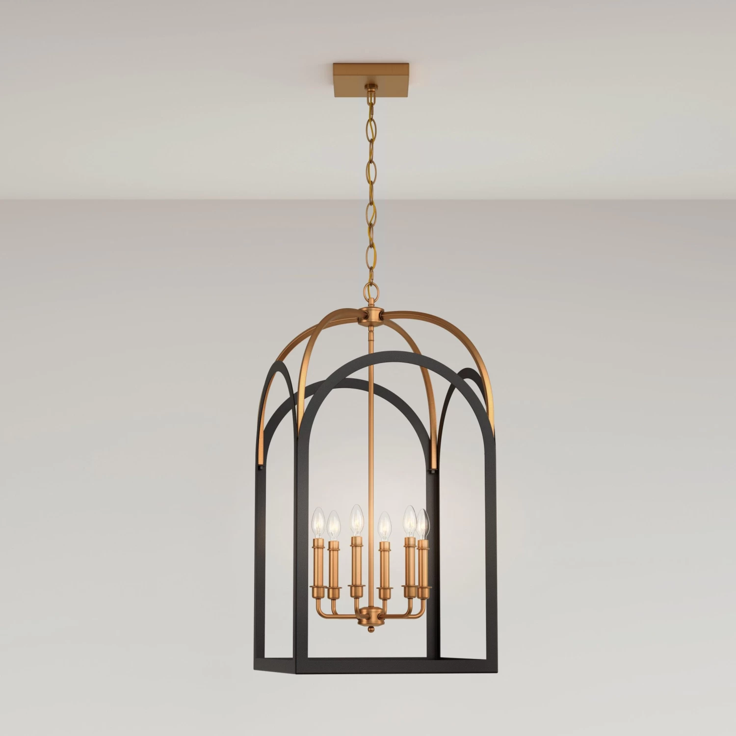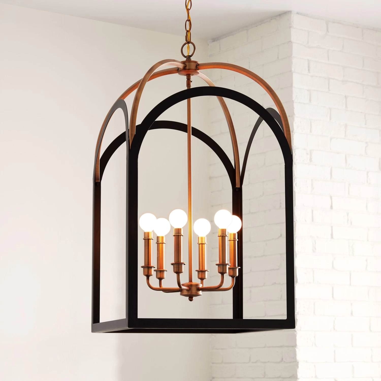 Boasting a two-tone, lantern-style cage, the Henrico Pendant Chandelier is the perfect statement pipece for your foyer or dining room. Its eye-catching design is made up of square metal tubes that come together to form a stylish work of art. Six candelabra light bulbs sit inside of the cage, which suspends from the ceiling by a sturdy linked chain. Mounting hardware is included for easy installation.