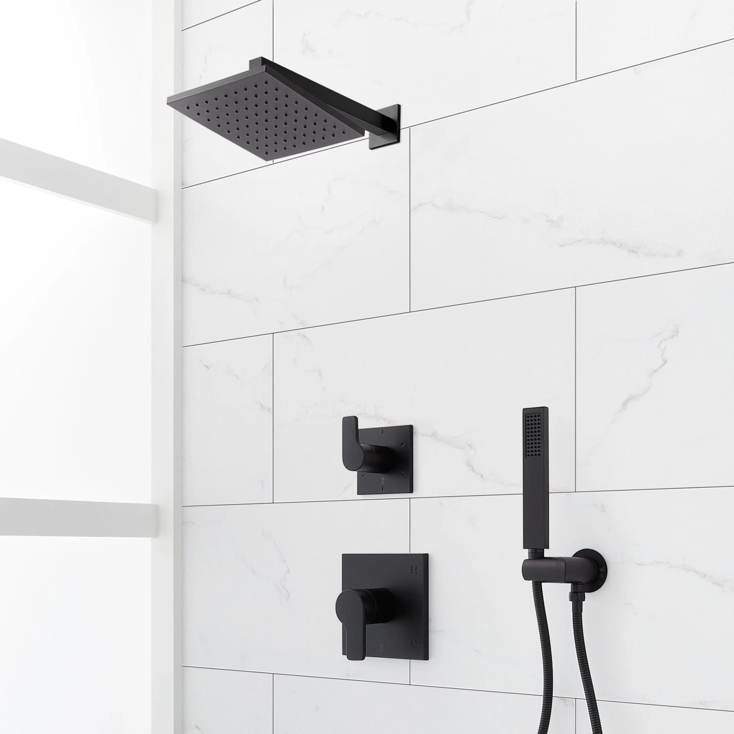 Bring modern luxury to your bathroom with the Hibiscus Pressure Balance Shower System with Hand Shower. Including a rainfall shower head, pressure balance valve, and convenient hand shower, the system’s clean lines and angular silhouettes give any shower setup a sleek, modern edge. Pressure balance technology keeps your selected water temperature and pressure consistent throughout use, providing a seamless shower experience. The included hand shower is perfect for reaching tricky spots or simply for a more direct stream. Designed to last and complement your space, the Hibiscus is complete with an array of stunning corrosion-resistant finishes.