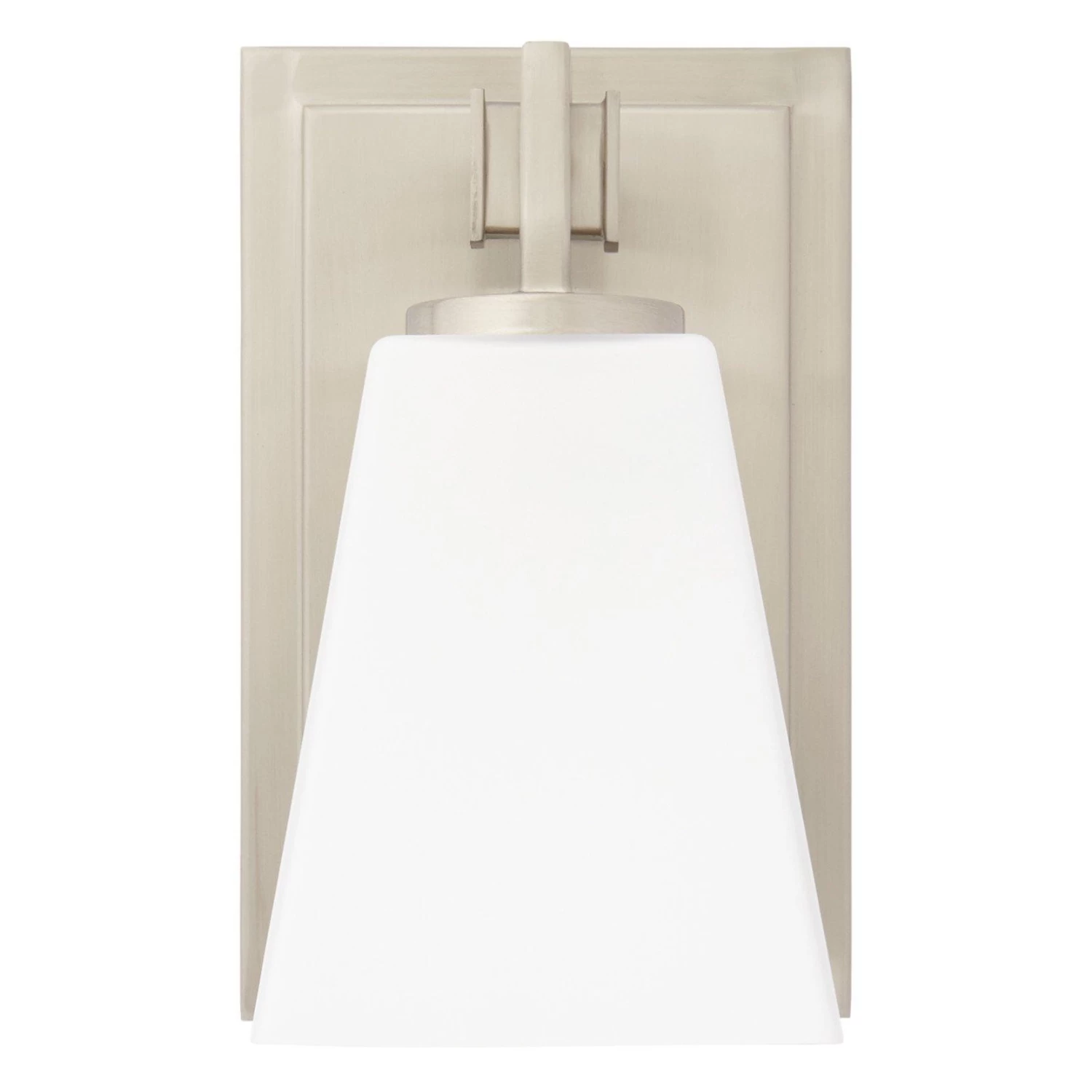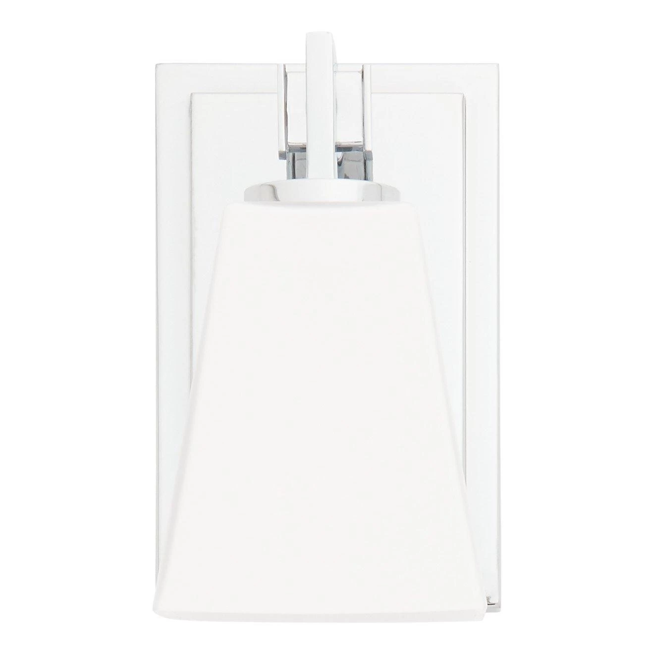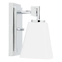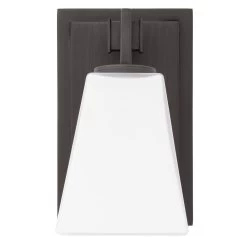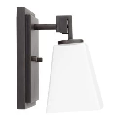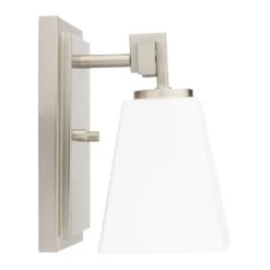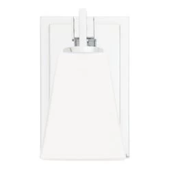The Hoxton Vanity Sconce has an angular design that is ideal for a modern space. The sleek build uses a mix of glass and metal to complement existing fixtures. The shade is made of opal glass to cast a soft light throughout your vanity area.