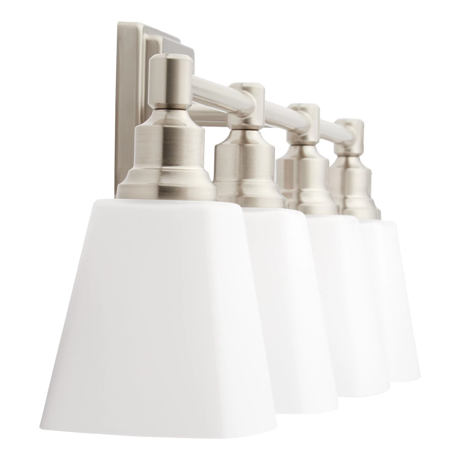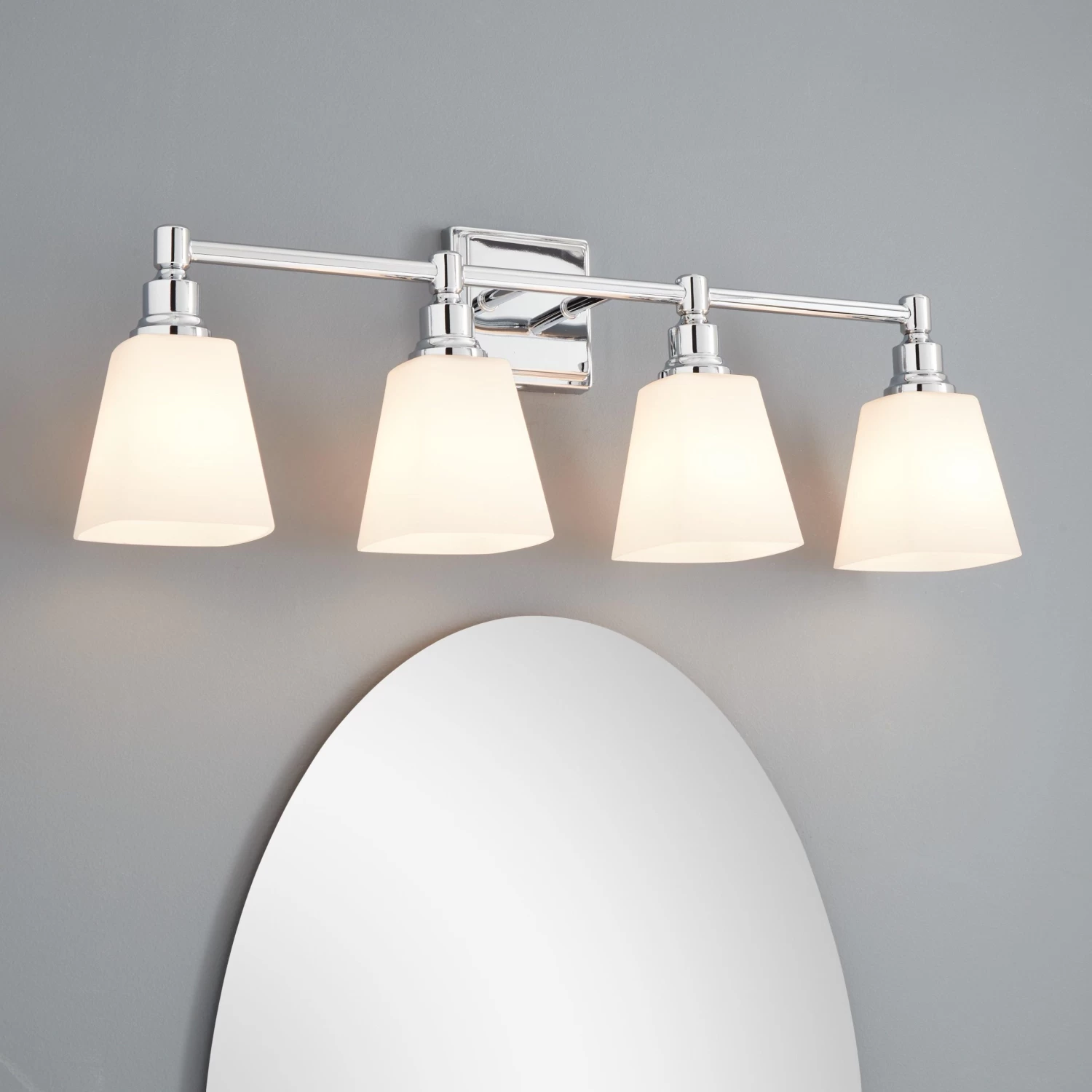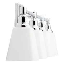 Enhance visibility in the bathroom with the Leadwell 4-Light Vanity Light. Wide and striking, this accent is ideal for projecting significant light throughout the space. With its clean lines and straightforward design, it’s a no-fuss option that adds warmth and understated elegance to a transitional or modern aesthetic. The lights are covered with attractive frosted glass shades, which lend subtle character to the room.