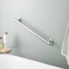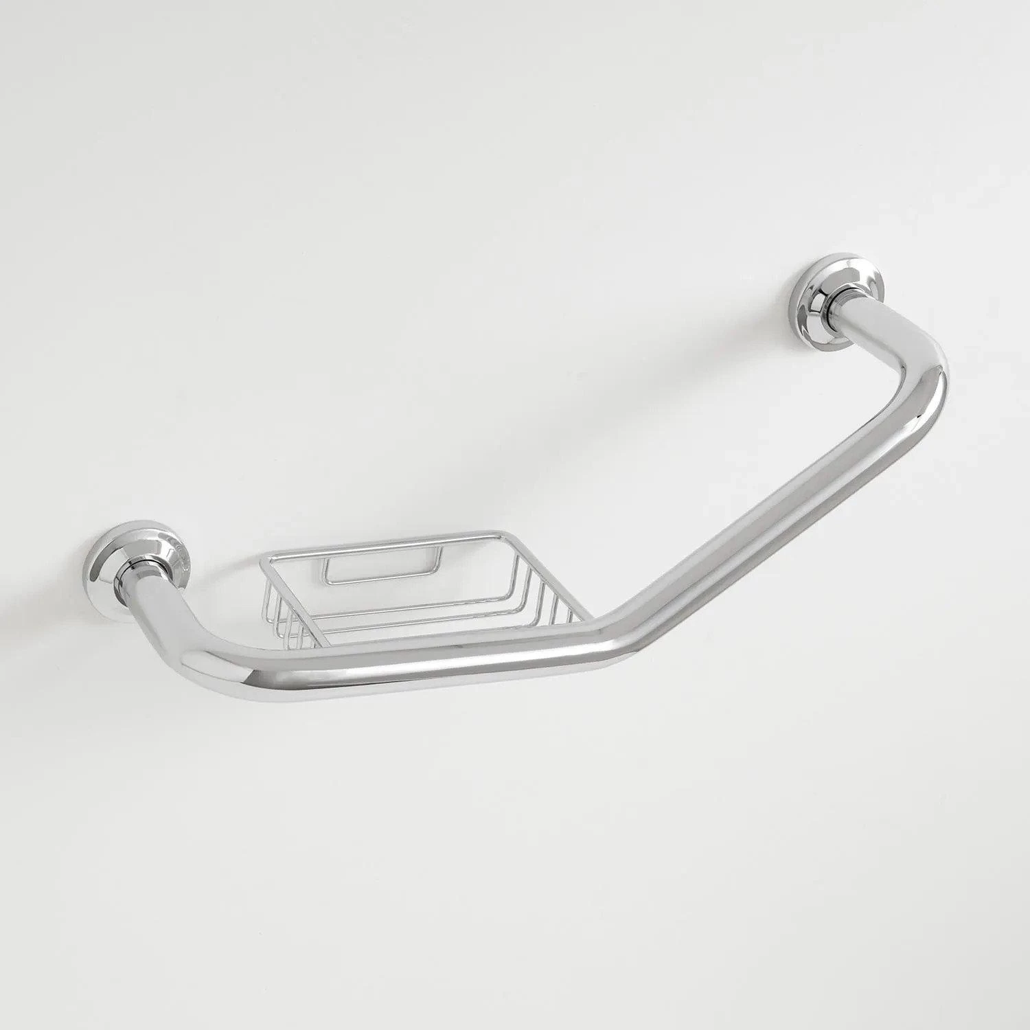 Get style and safety with the Lenoir Angled Grab Bar with Basket. Made of durable solid brass, this grab bar also keeps your favorite soap within reach.