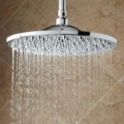 - Shower system includes ceiling mount rainfall shower head, two wall-mount slide bars with hand showers, two hand shower water connections, four body jets and a thermostatic 3-way in-wall diverter.