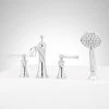 Enjoy a luxurious bath with this exclusive thermostatic wall-mount tub faucet. This beautifully crafted fixture combines a tub filler and handspray with decorative cradle. Features Lever Handle diverters and a Cross Handle control for temperature and pressure balance.