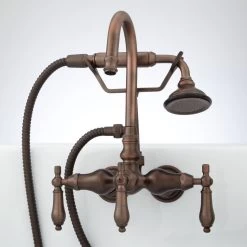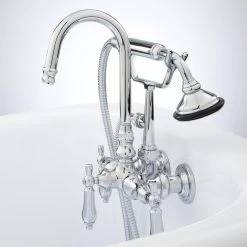This gooseneck faucet features sleek, metal lever handles, a convenient hand shower and a stylish design.