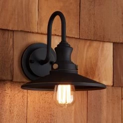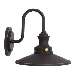 Greet your guests with a warm and welcoming glow by adding the Pimmet Outdoor Entrance Wall Sconce to your porch or patio. This industrial-inspired fixture features a warehouse-style shade and a rust-proof, oil rubbed bronze finish. Complete with a high-arching arm, the Pimmet comes with all hardware necessary for installation.