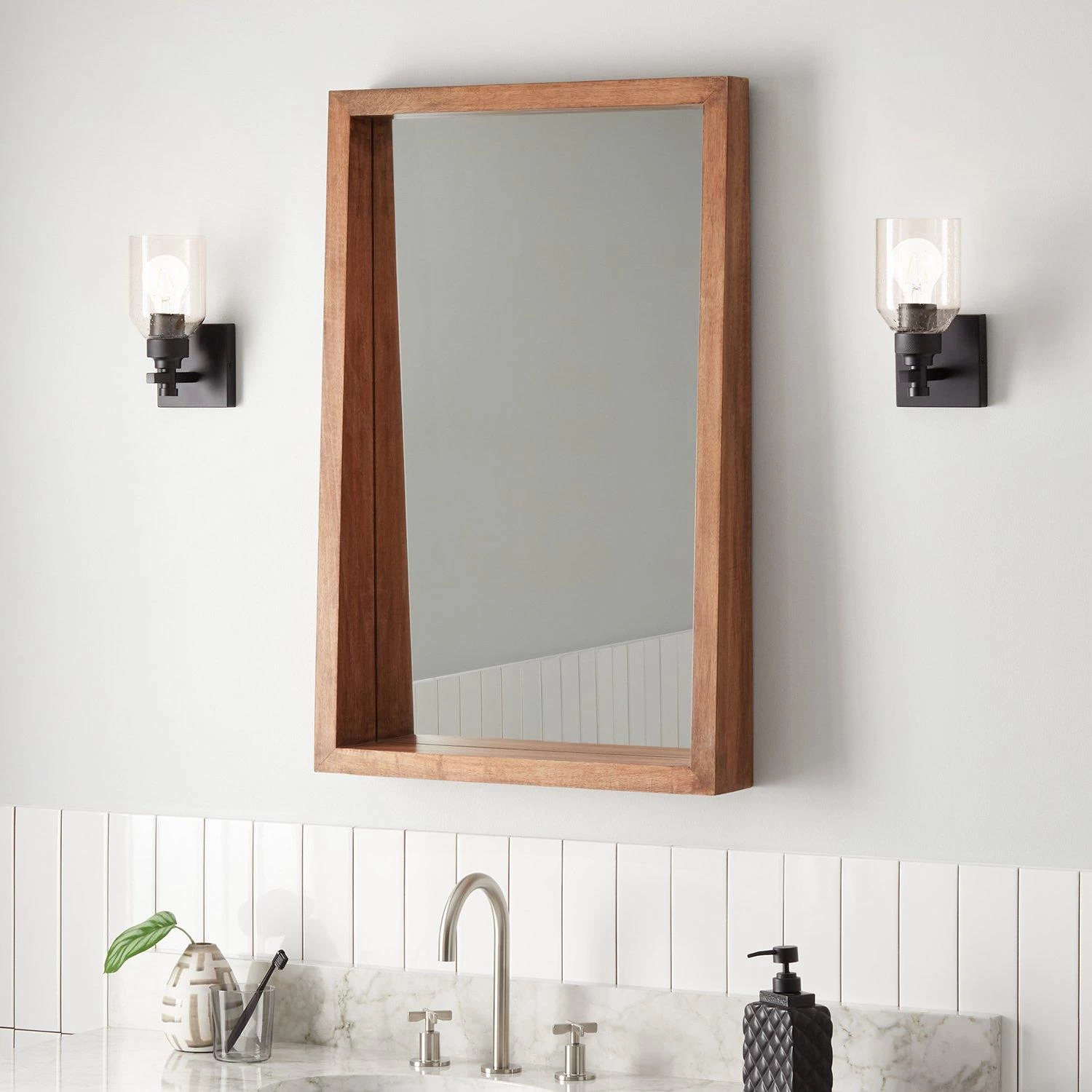 Accent a thoughtful, organic space with the Ranlyn Rectangle Wood Vanity Mirror. Surrounded by a natural mango wood frame, this mirror adds understated visual texture to any vanity setup. With the frame extending from the mirror itself, a functional shelf is created for displaying your everyday items. To complete the design, a french cleat mounting system is included for easy installation.