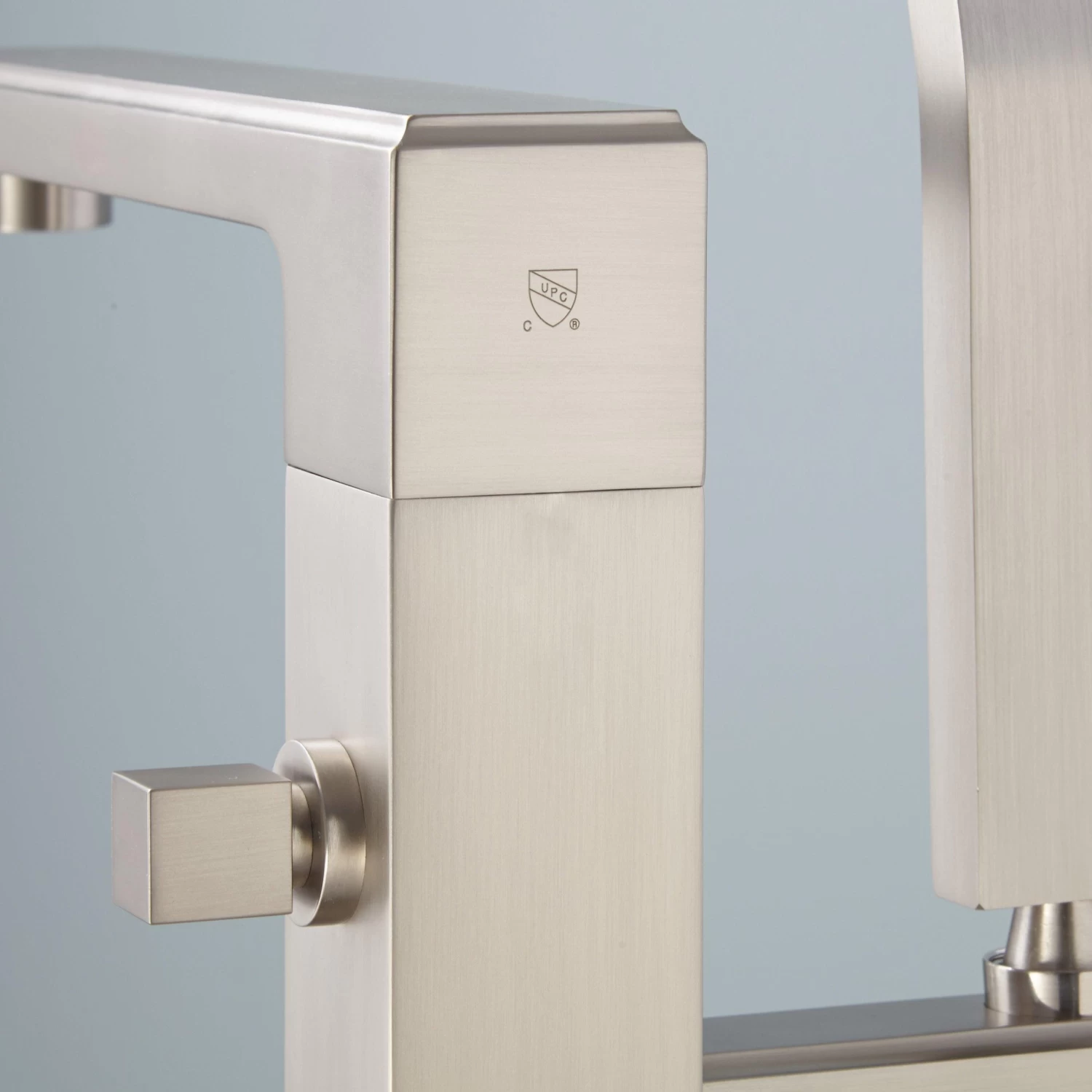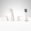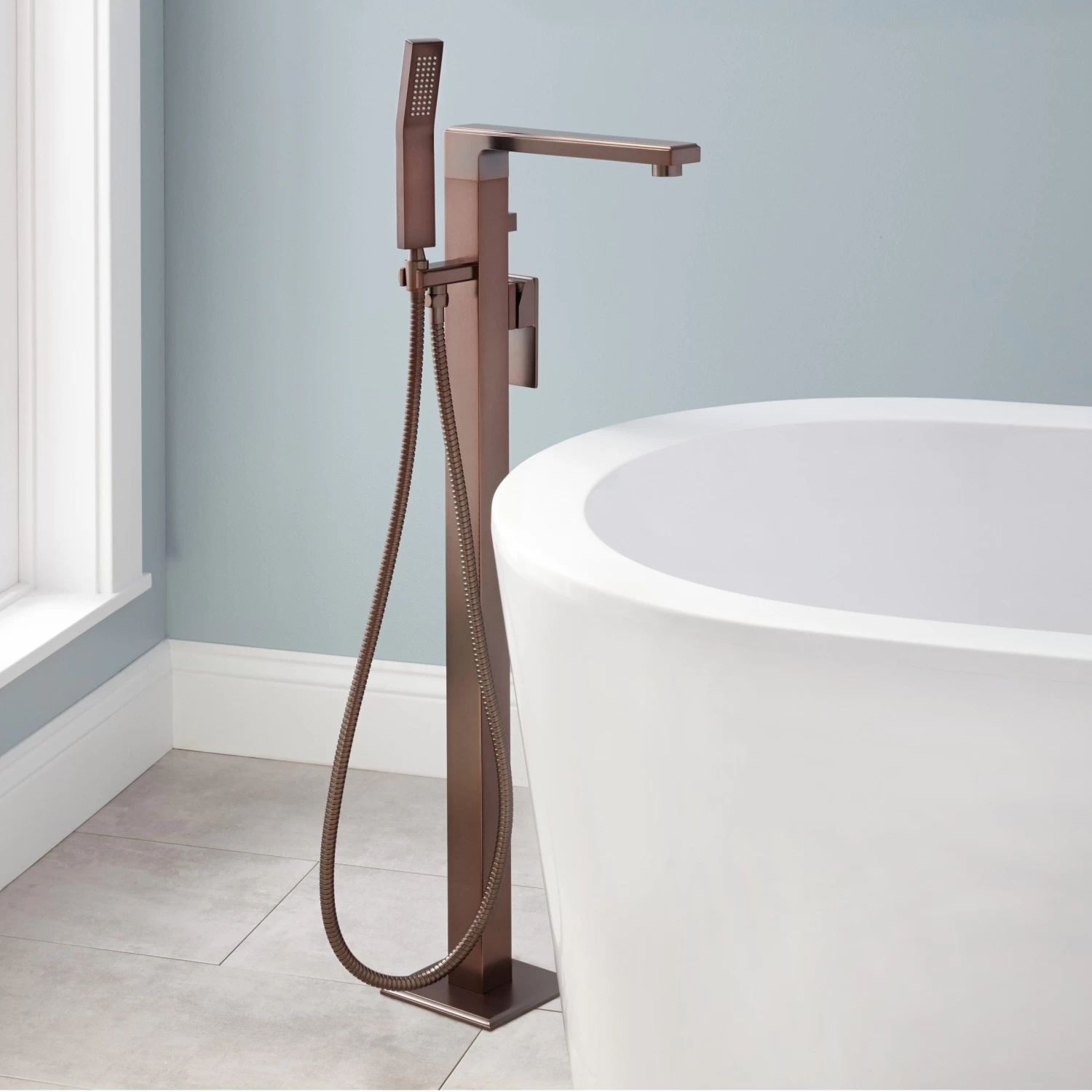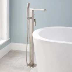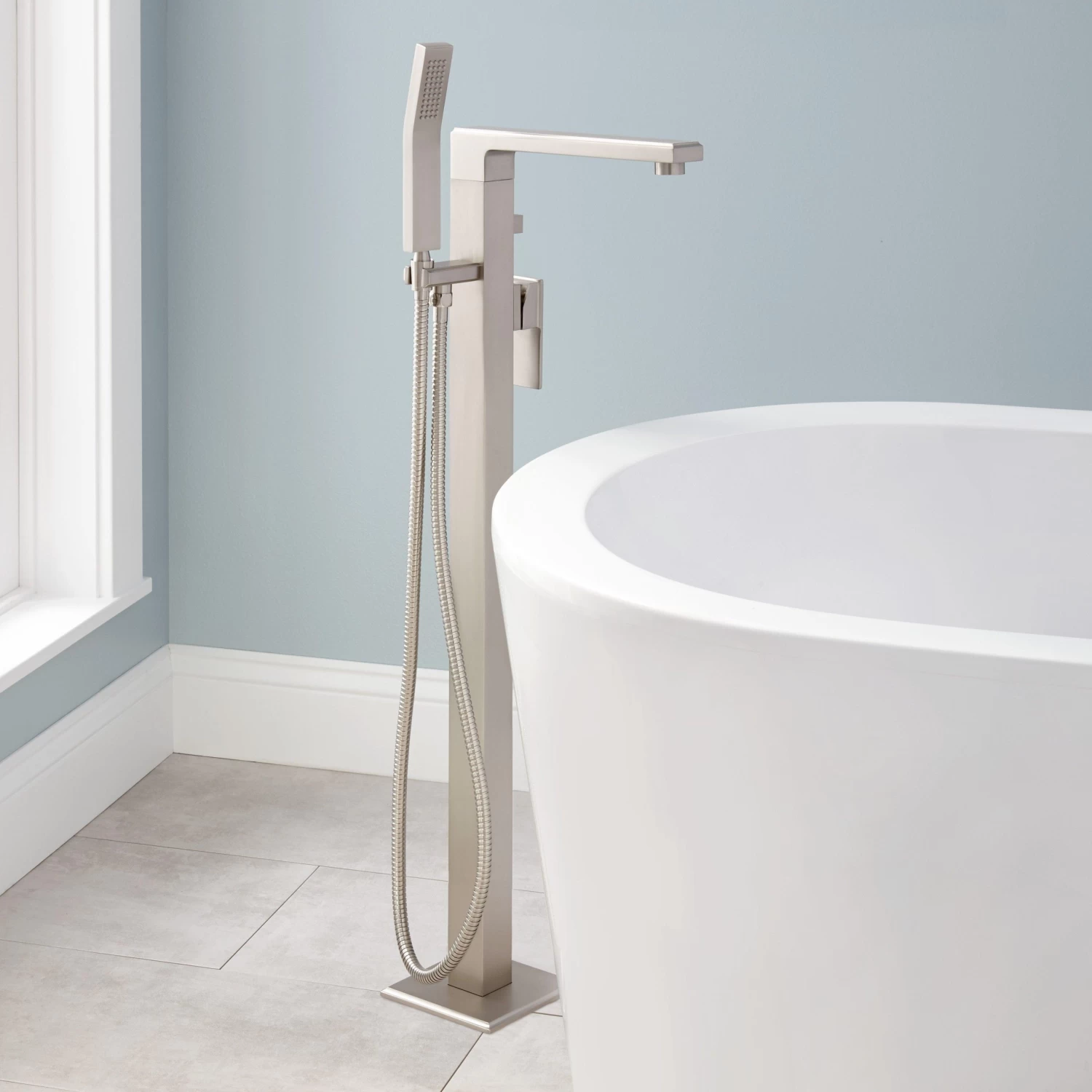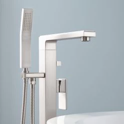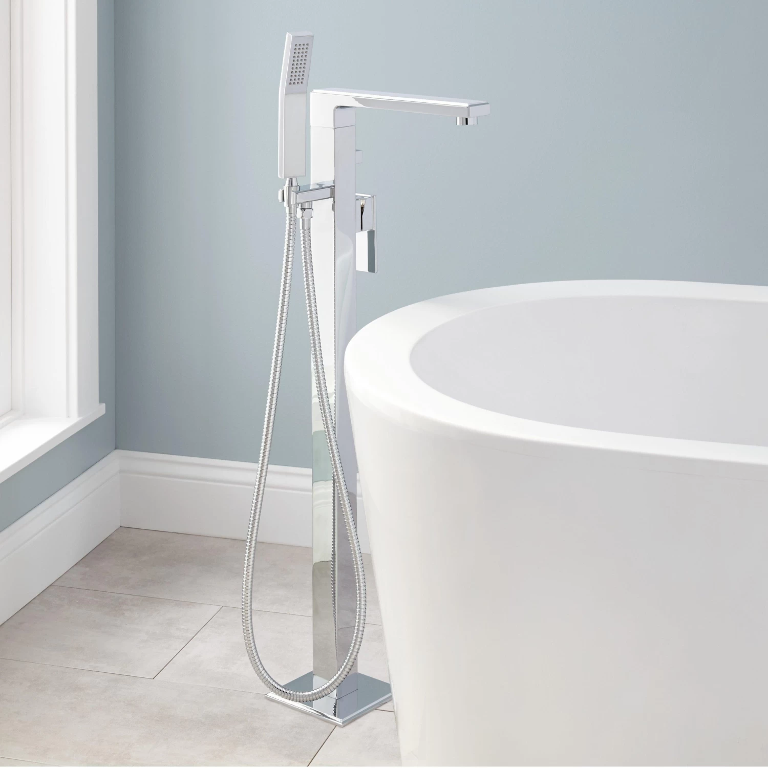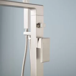 The Ryle Faucet is an excellent fixture to stand alongside your contemporary bathtub. Clean lines and the squared features of the spout, lever, and hand shower enhance the modern look of your space. The Ryle is made of high quality materials to ensure lasting quality. To coordinate with other fixtures in your bathroom, a premium finish has been applied to this freestanding tub faucet.