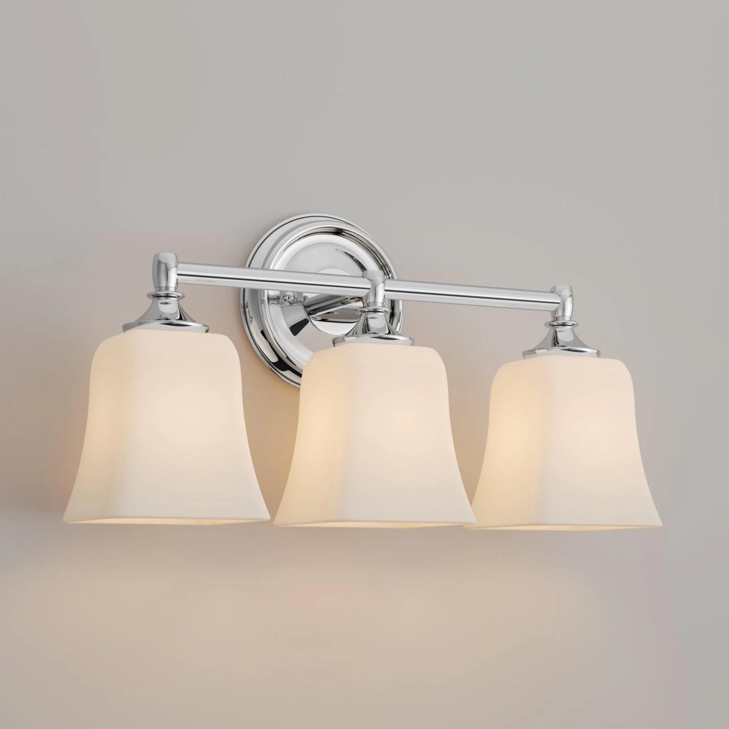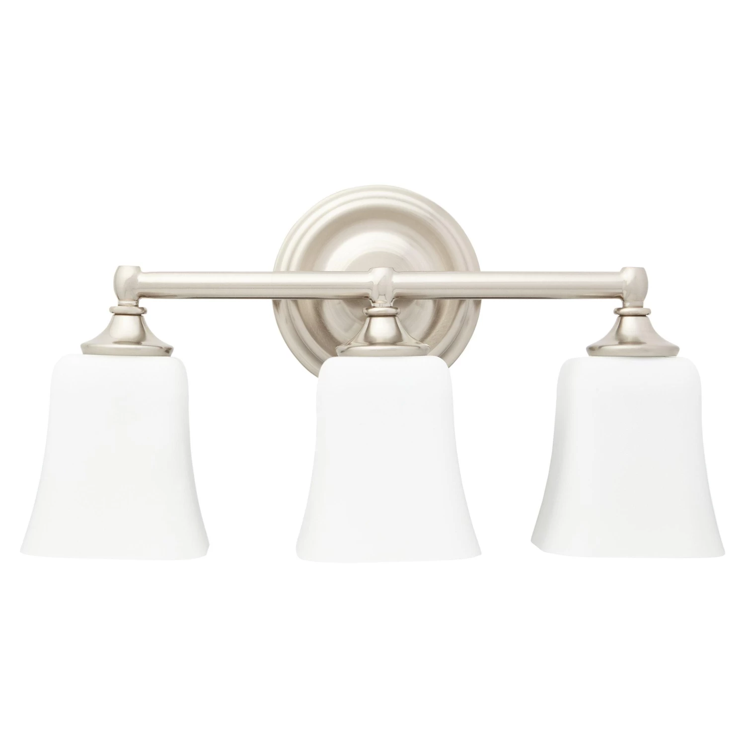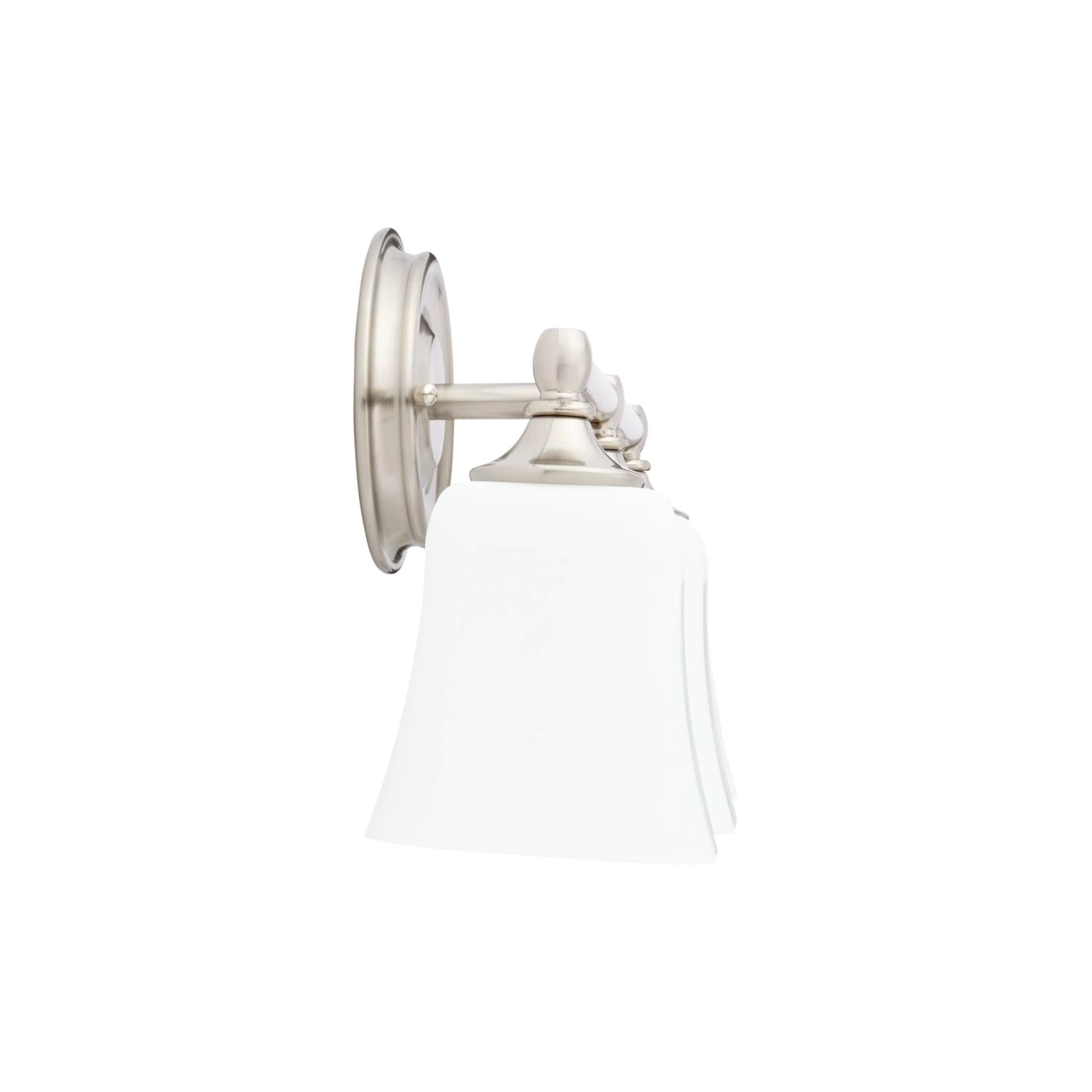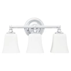 Add classic lighting to your bathroom with the Scarborough Vanity Light. The timeless design is enhanced by the flared shape of the shades, which are made of opal glass. The metal is covered with a high-quality finish that resists tarnishing.