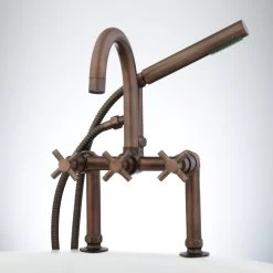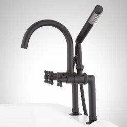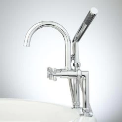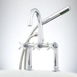 The perfect addition for your contemporary bathroom, this Deck-Mount gooseneck faucet features cylindrical cross handles and a sleek, modern hand shower.