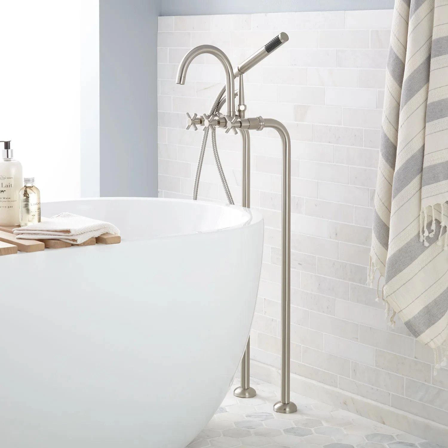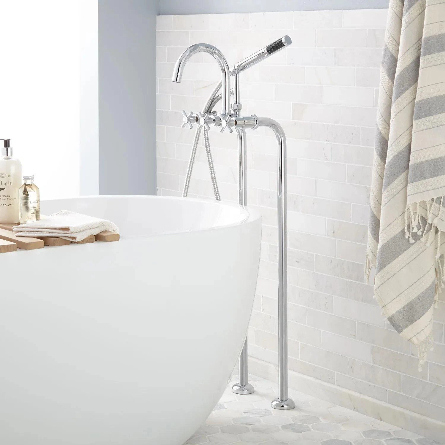 Featuring modern, cylindrical cross handles, The Sebastian Freestanding Tub Faucet will add a stylish and contemporary look to your bathroom.
