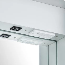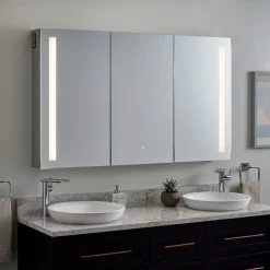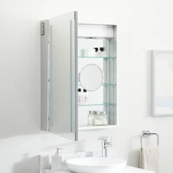 The Seren Lighted Medicine Cabinet is the ultimate addition to any contemporary or transitional style bathroom. Providing ample storage space and adjustable shelves made of tempered glass, the aluminum cabinet also boasts touch sensor button and tunable LED lighting to change the color temperature. Plug your appliances directly into the standard electrical outlet, which also includes a USB port. This feature-packed product is also equipped with a wireless speaker to play music from your phone and features a magnified makeup mirror on the backside of the door.