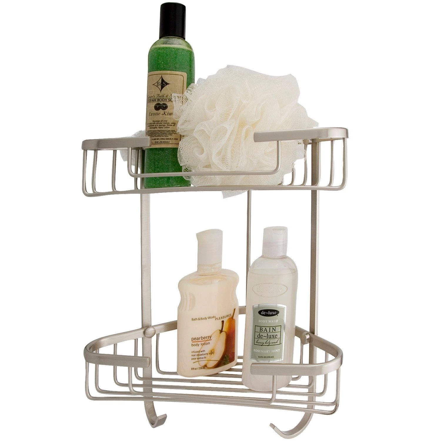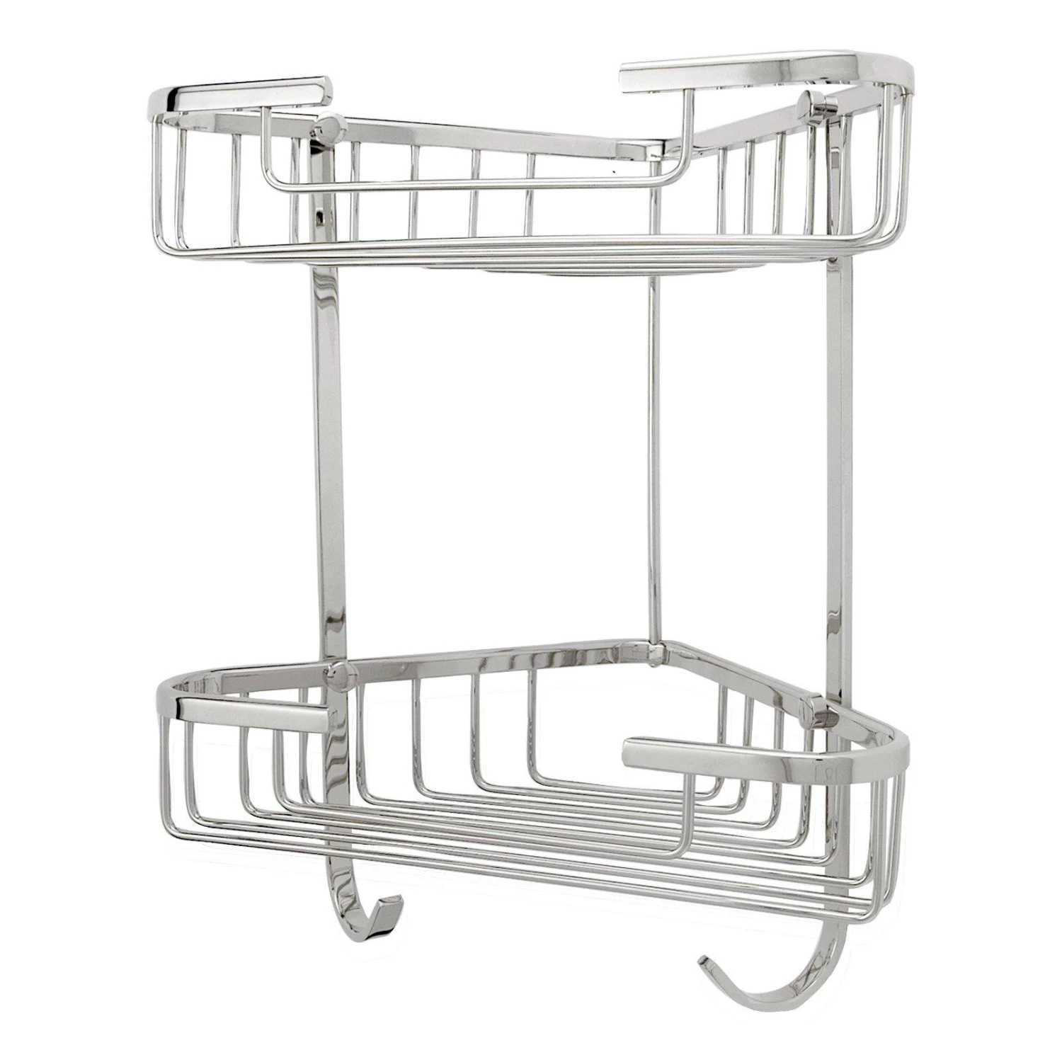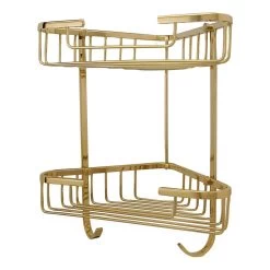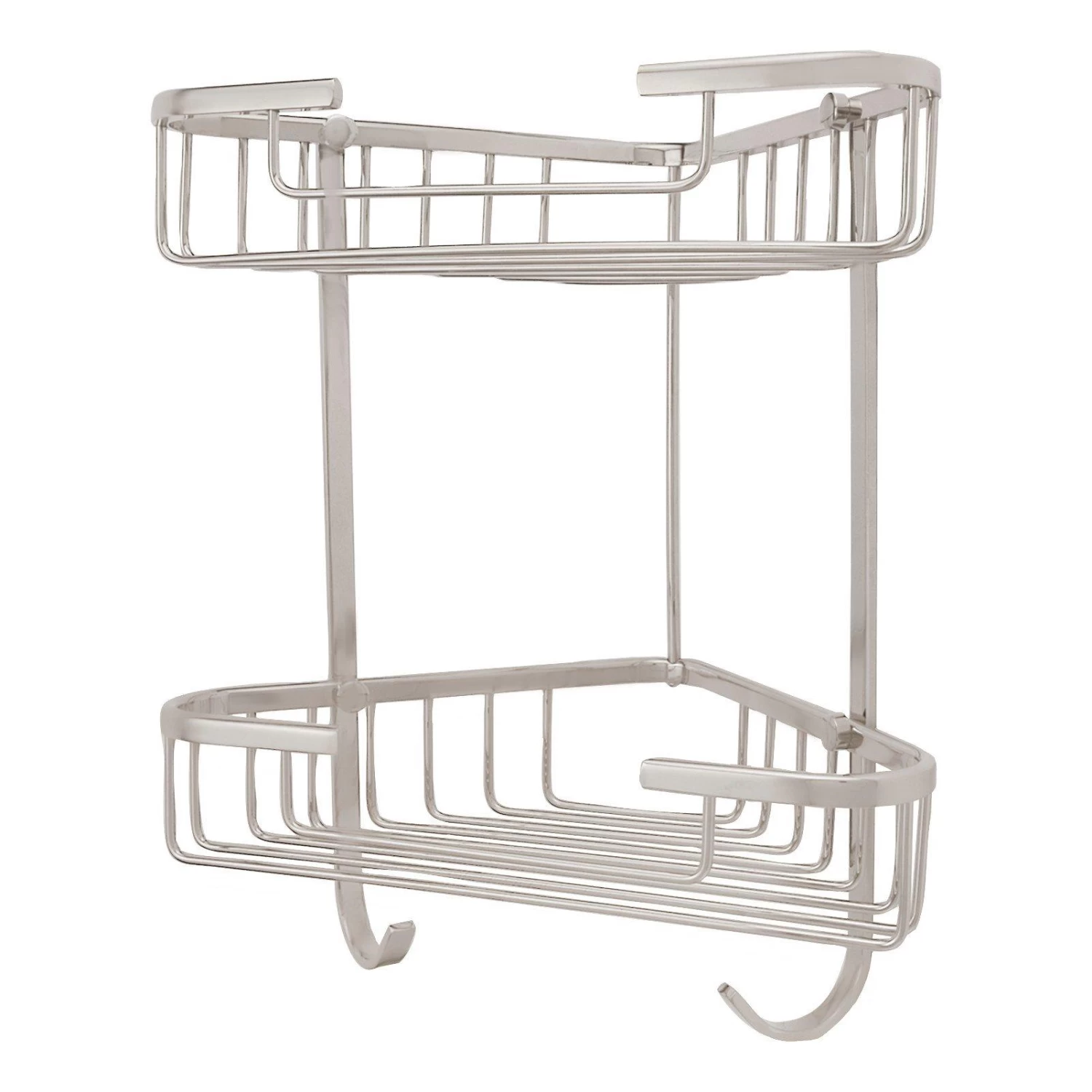 The Solid Brass Two Tiered Corner Basket provides abundant storage space for your shampoo, soap bottles and other bath necessities. Its mounting rods curve at the bottom, where washcloths can easily hang.