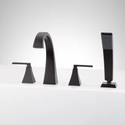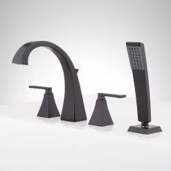 The Vilamonte Roman Tub Faucet boasts sleek, angular lines that are softened by its curved, arching gooseneck. This stylish faucet features easy-to-use lever handles and adds contemporary flair wherever installed. The coordinating hand shower is always within reach and offers the benefit of easy rinsing. Construction with high end materials and a premium, rust-resistant finish make the Vilamonte a lasting master suite addition.