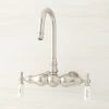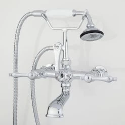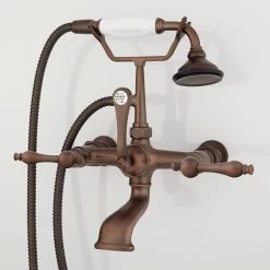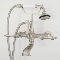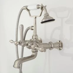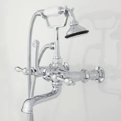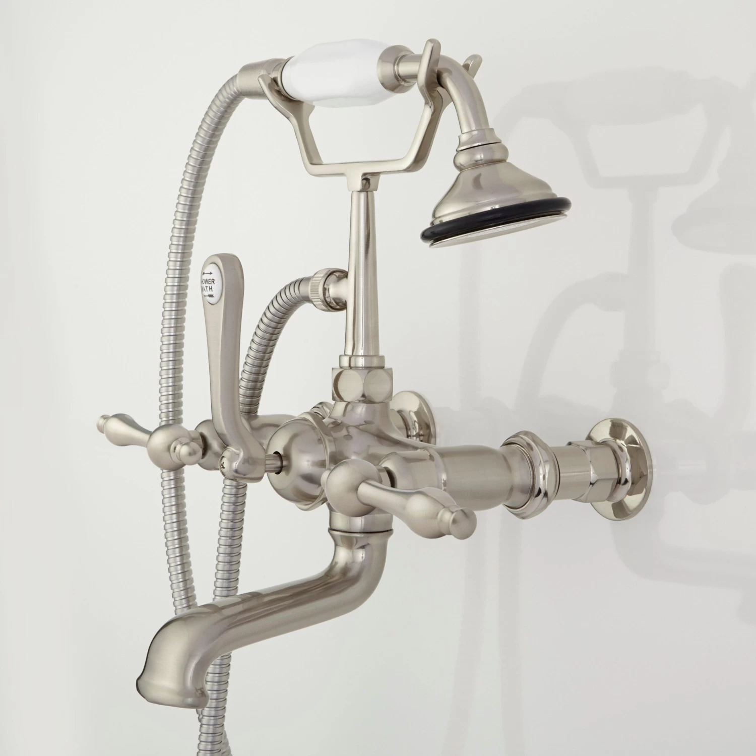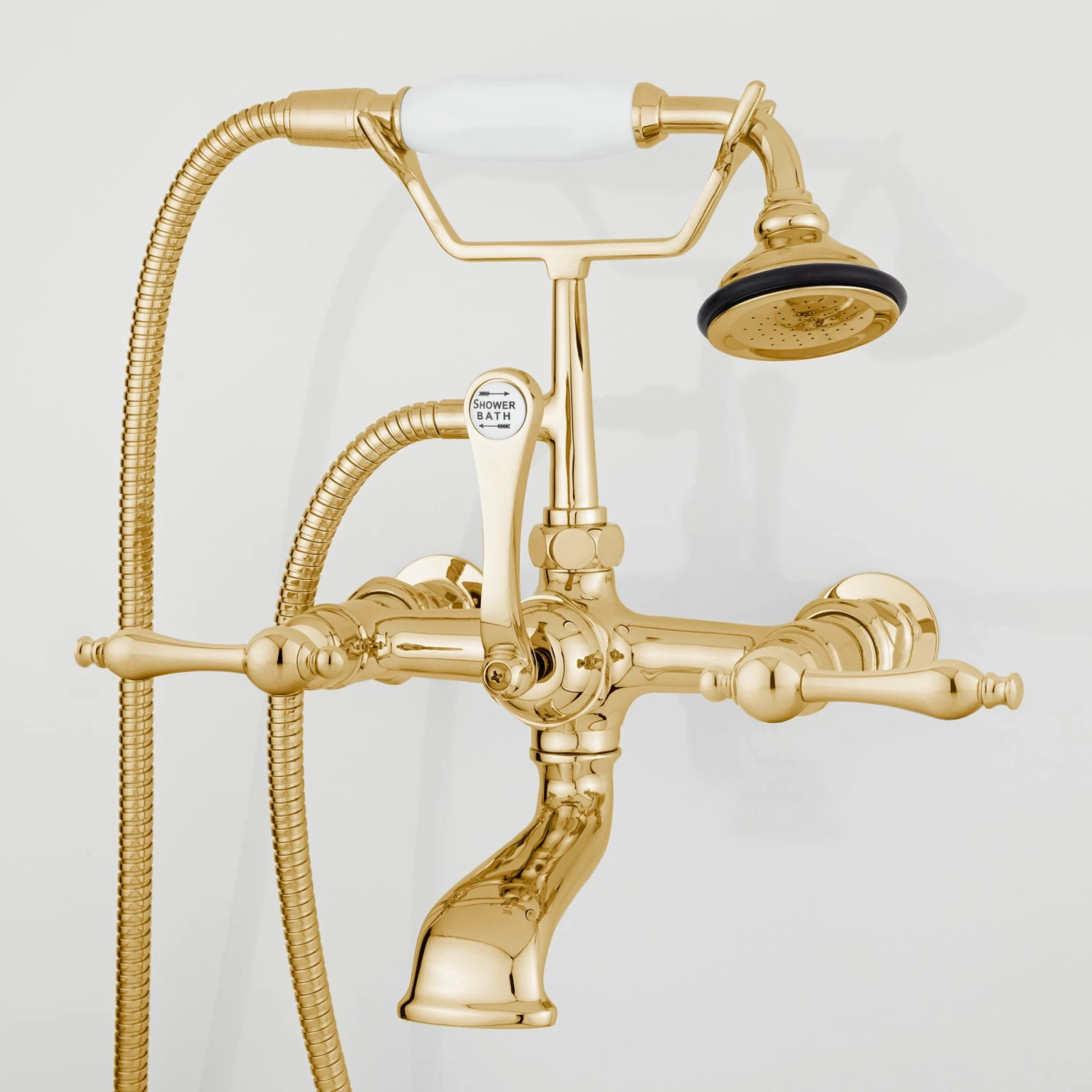 Elegance is at your fingertips with this English Telephone Wall-Mount Tub Faucet with Hand Shower. Use the clearly labeled lever handles on the taps and the shower diverter to adjust the temperature and setting that suits your mood.
